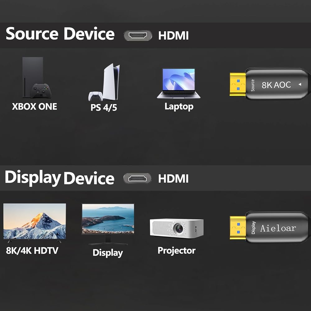 About Aieloar 8K Optical Fiber HDMI 2.1 Cables Features: --with 8K@60Hz 7680*4320 resolution,HDCP2.2, 4:4:4,support 8K@60Hz/4K@120Hz/2K@144Hz,support dynamic HDR,VRR,QMS,Earc,ALLM. --48 Gbps bandwidth,support CEC and fast frame transfer,achieves long distance transmission over 300fts without delay and loss. --single way transmission,plug and play,easy for bury or in-wall installation,doesn`t need any external power supply. Notice: unlike the normal cooper HDMI cable, the optic fiber 8K hdmi 2.1 cable only support single direction transmission.SOURCE port for connecting HDMI signal source like Blu-ray,TV box,PS5 console,computer,laptop,etc. DISPLAY port for connecting HDMI display devices like 8K TV, cinema projector, monitors,etc. please keep an eye on the DISPLAY SOURCE port and install the cable in a right way.