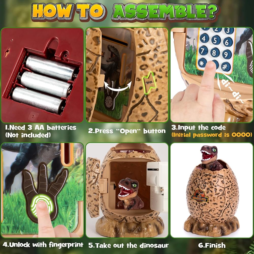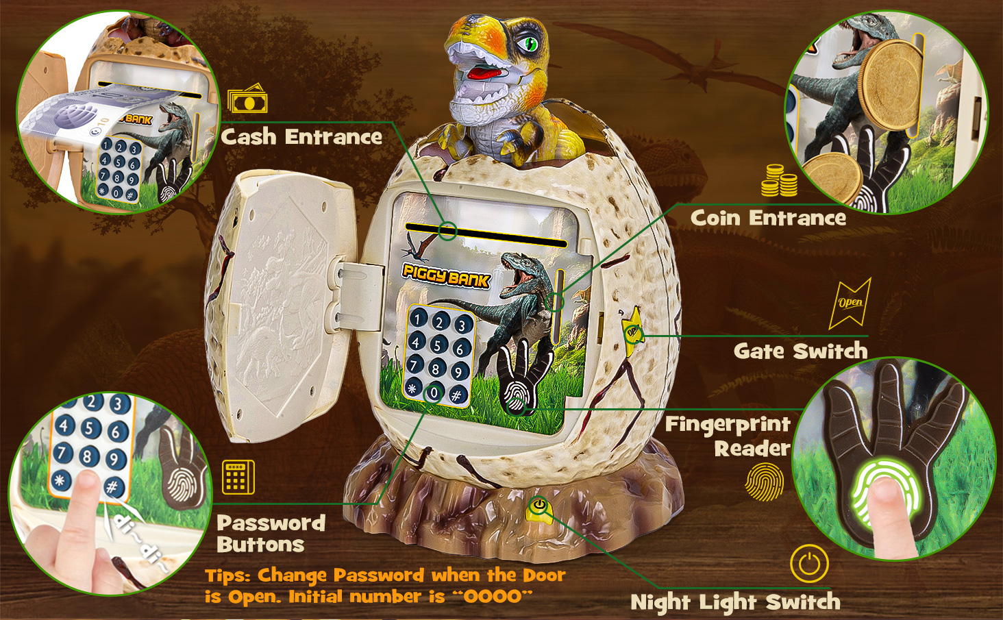 • قم بقفل الأموال بشكل آمن باستخدام كلمة المرور - توجد فتحة للعملات المعدنية ومدخل للفواتير، حيث يمكنك إيداع الفاتورة وسيأخذها بنك الديناصور الخنزير تلقائيًا. يأتي نظام كلمة المرور مزودًا بقفل رمز وزر بصمة إصبع. أدخل الرمز الصحيح والمس الزر، وسيتم فتح بوابة البنك تلقائيا. يمكن للأطفال تغيير كلمات المرور عدة مرات للحفاظ على أمان الحفظ باتباع التعليمات.