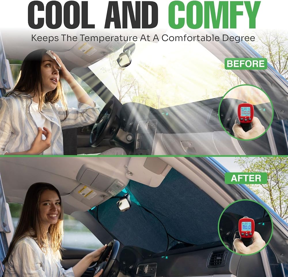 ✓ تصميم داخلي رائع - ستخفض مظلة الشمس للسيارة درجة الحرارة في سيارتك بمقدار 30-50 درجة حتى عندما تكون متوقفة، لذلك يمكنك أنت وعائلتك الاستمتاع بالركوب في سيارة رائعة ومريحة، دون حرق يديك على عجلة القيادة.
