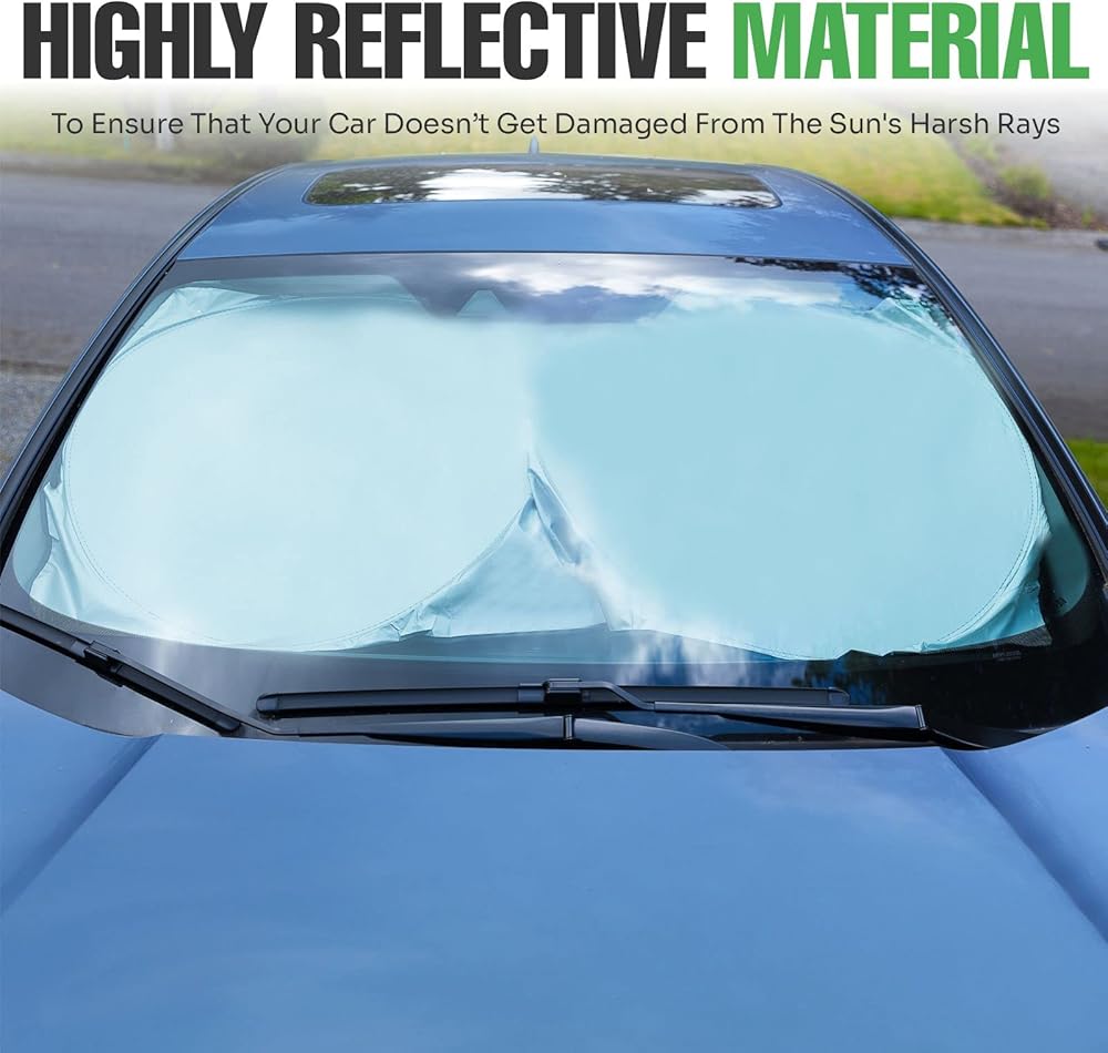 ✓ مادة عاكسة - غطاء الشمس للزجاج الأمامي للسيارة مصنوع من مادة واقية من الشمس 240T عاكسة للغاية لضمان عدم تعرض سيارتك للتلف من أشعة الشمس القاسية. كما أنها مصنوعة بإطار معزز للخدمة الشاقة لذا يجب أن تصمد بشكل آمن.