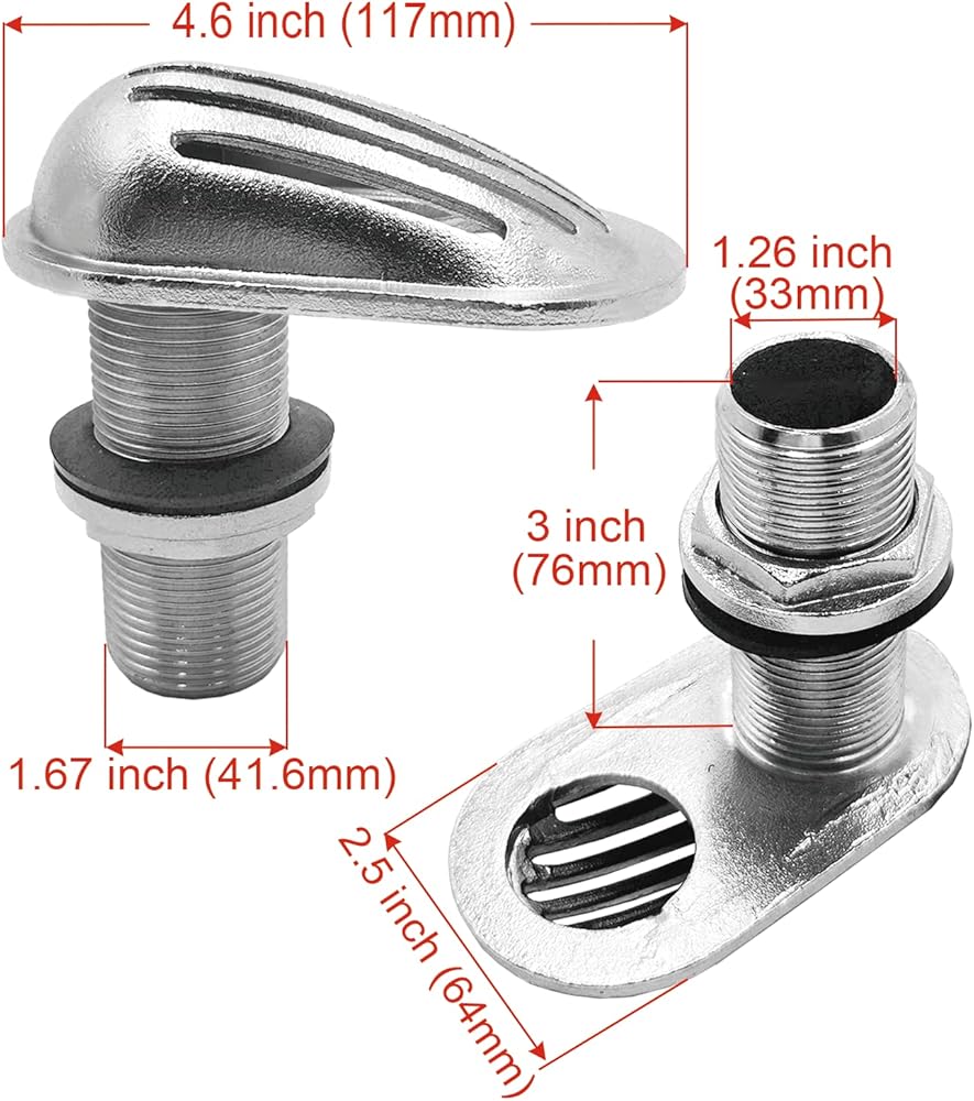 YANYU 1-1/4" Boat Intake Strainer NPT Threaded Standard American Thru-Hull Inlet 1-1/4" Filter Scoop Marine Stainless Steel 316 with Rubber Washer Gaskets NPT Threaded Standard American 1-1/4 inch Boat Intake Strainer Thru-Hull Inlet 1-1/4 inch Filter Scoop Marine Stainless Steel 316 With Rubber Washer Gaskets. Thru hull inlet size 1-1/4 inch with intake strainer; Inner Threaded Dia.: Approx. 1-1/4"/33 mm ; Outer Threaded Dia.: Approx. 1.67"/41.6mm ; Threaded:NPT Threaded Standard American,Boat Intake Strainer can be used with standard American threaded fitting and standard American valves. Marine stainless steel 316 material precise casting, corrosion-resistant, rust-proof, strong and durable. Clear anodized, no scratches, no burrs, will not flake, chip or scratch easily, and can resist the marine environment. The anticorrosion and waterproof cover mirror polishing treatment can well separate oil and clean it with one wipe, has long service life. Suitable for marine boat,yacht,kayak etc, a good damage part replacement choice. Made using the highest quality components, go through performance and quality tested. Package List: 1 Piece 1-1/4" Boat Intake Strainer; 1 Piece Rubber Washer Gaskets