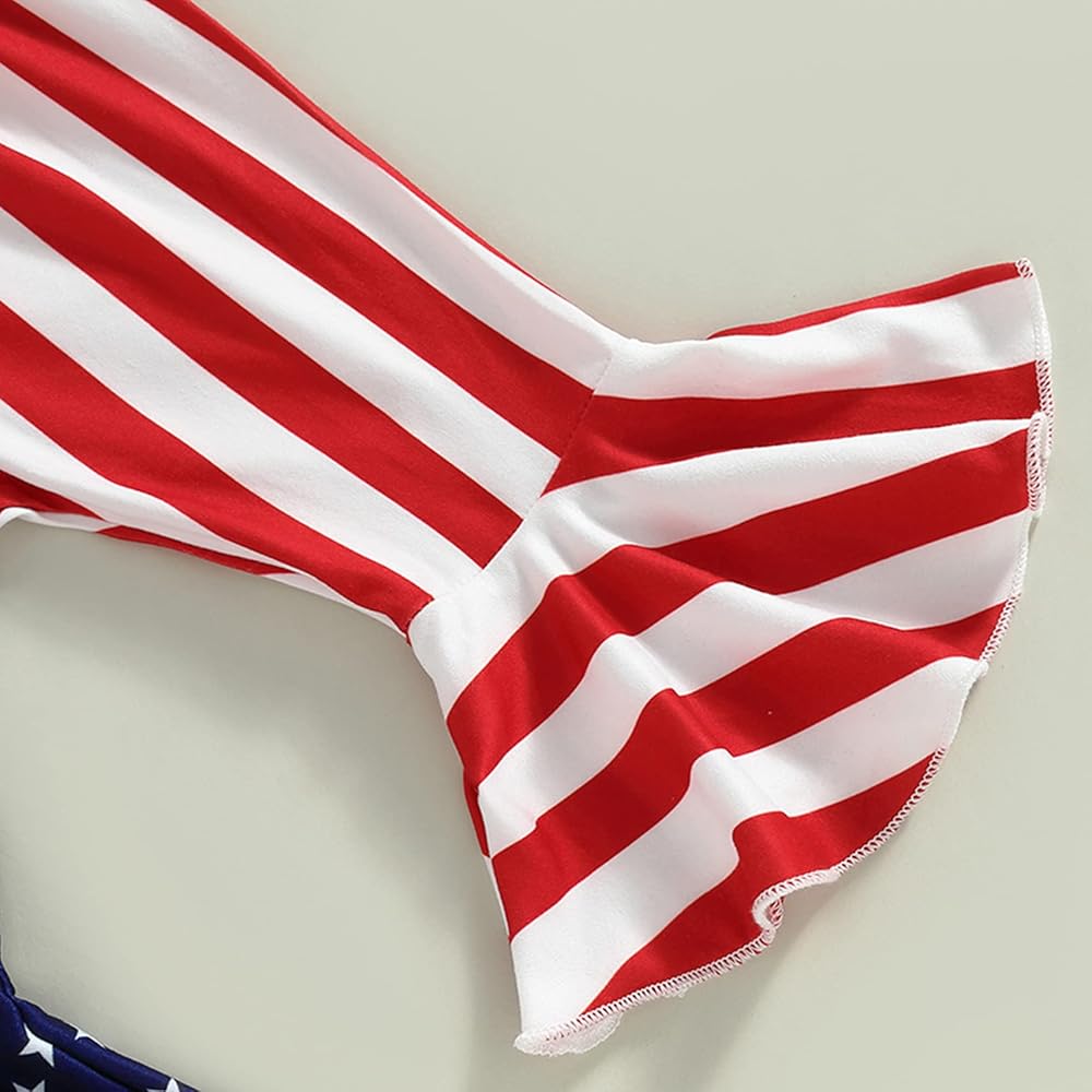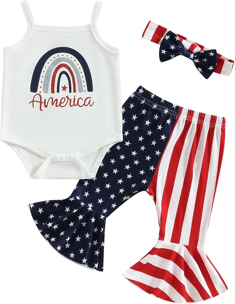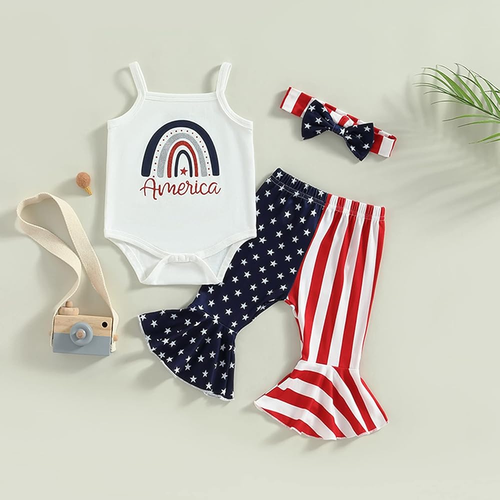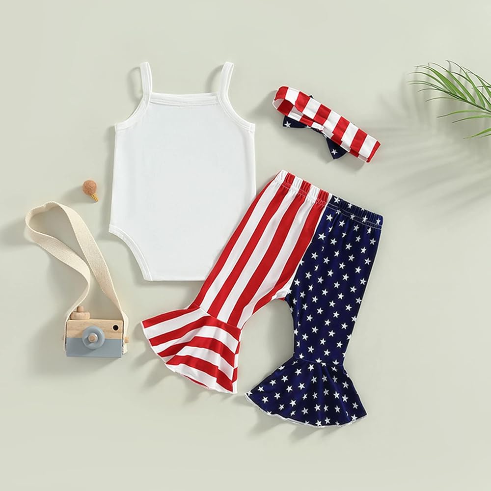 Item: Newborn Baby Girl 4th of July Outfits Sleeveless Romper Bodysuit+American Flag Bell Bottom Pants+Headband