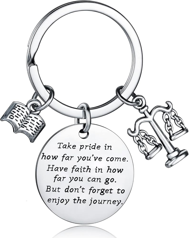 The keychain Engraved with meaningful words "Take pride in how far you've come. Have faith in how far you can go. But don't forget to enjoy the journey".If you are looking for a thoughtful gifts for your family and friends engaged in legal work now or in the future.The exquisite keychain is the best choice.