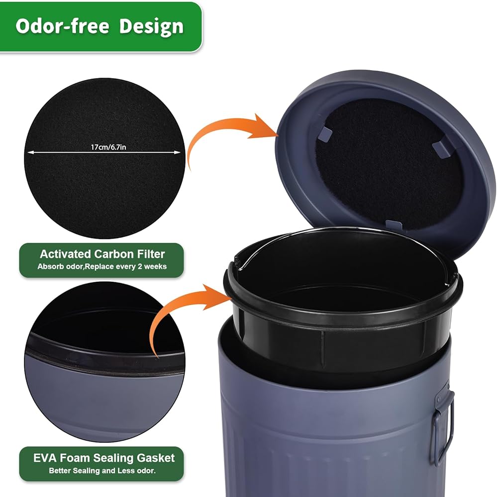 【كفاءة خالية من الروائح】مجهزة ببطانة إسفنجية EVA ومرشحات الكربون المنشط، يمكن لسلة المهملات الحديدية هذه أن تحبس الروائح، مما يضمن حلاً متعدد الوظائف ومنعشًا لبيئات مختلفة. تشتمل العبوة على 12 فلترًا لإزالة الروائح الكريهة، مما يعزز مساحة معيشة خالية من الروائح مع عمليات الاستبدال الموصى بها كل أسبوعين.