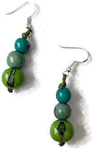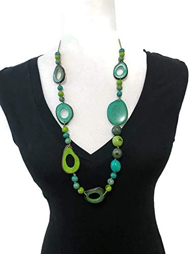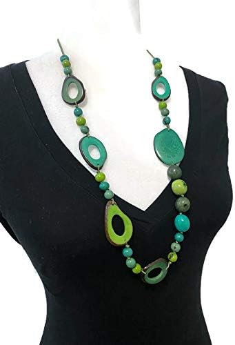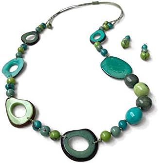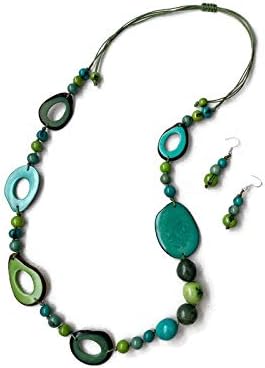 Tagua Nut Necklace and Earrings in Green, Lime, Teal. Necklace Length: 40 inches Adjustable to shorter length, Earrings length: 1 3/4 inches long. About Tagua This Product is handcrafted from a palm tree nut native to the lush tropical rainforests of Ecuador. Also referred to as the Ecuadorean Ivory Palm, the Tagua tree produces several bushels of seed pods a year with up to 100 Tagua nuts per pod. These nuts are then harvested, dried, and crafted into a wide range of products from vibrant modern jewelry, ornate figurines, to everyday items like shirt buttons. Also known as Vegetable Ivory, Tagua has the same appearance, density, and feel of animal ivory without doing any harm to any animals or the rainforests where it is gathered.