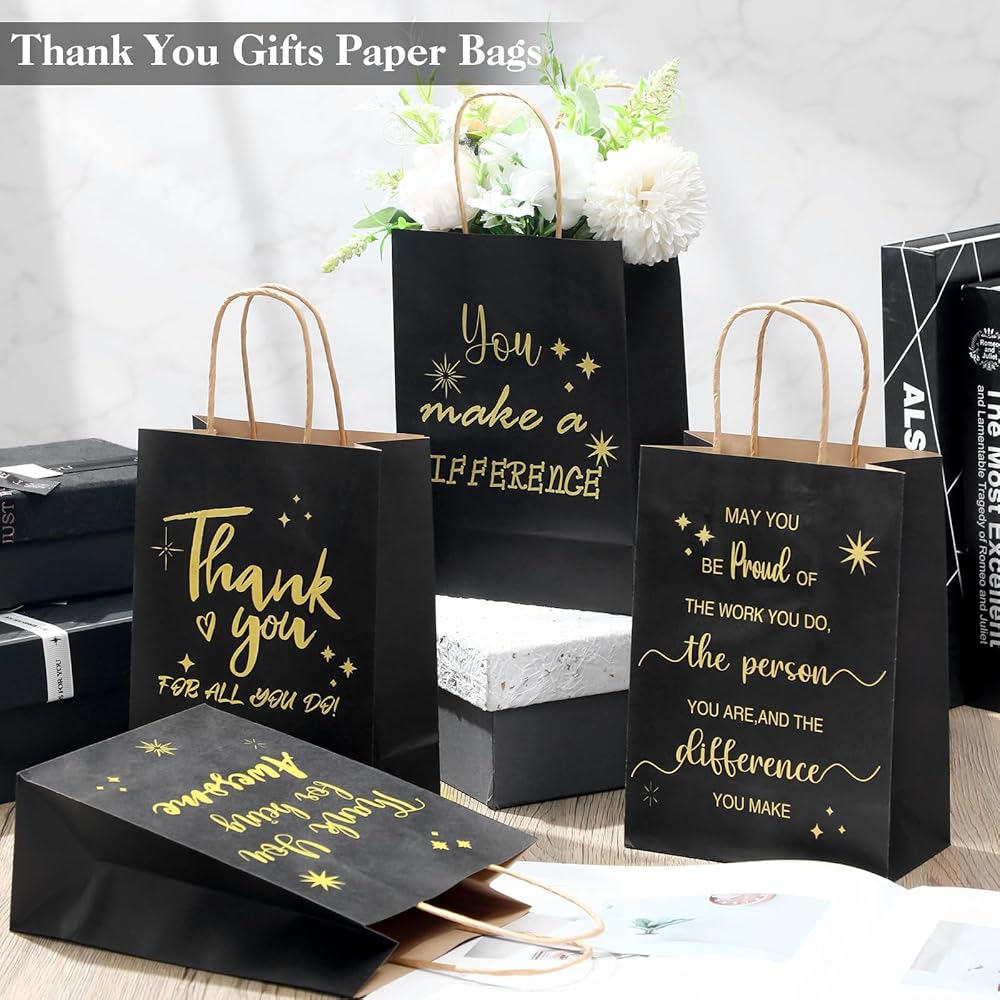 عبر عن امتنانك بالأناقة: ارفع هداياك أو الأشياء الجميلة مع حقائب هدايا تقدير الموظفين هذه؛ مصنوعة من ورق كرافت أبيض عالي الجودة 100 جرام في المتر المربع، هذه الحقائب تضفي الأناقة والاحترافية؛ تتميز برسالة تبعث على الدفء، "شكرًا لك على كونها رائعة" مطبوعة باللون الأسود على كلا الجانبين، مما يجعلها حقائب هدايا مثالية لتقدير الموظفين.
