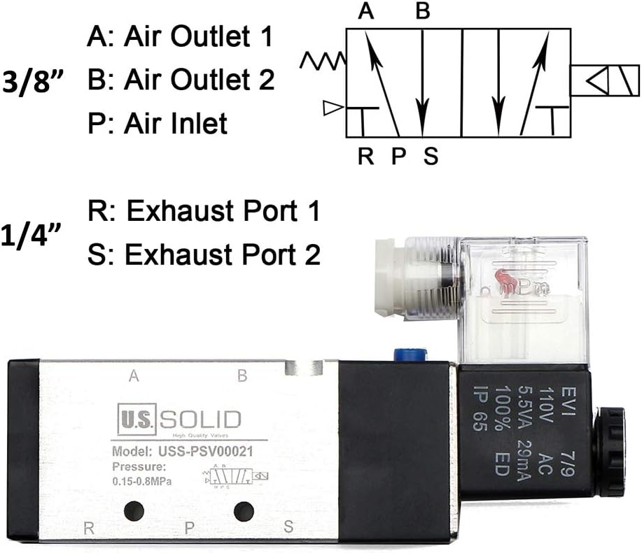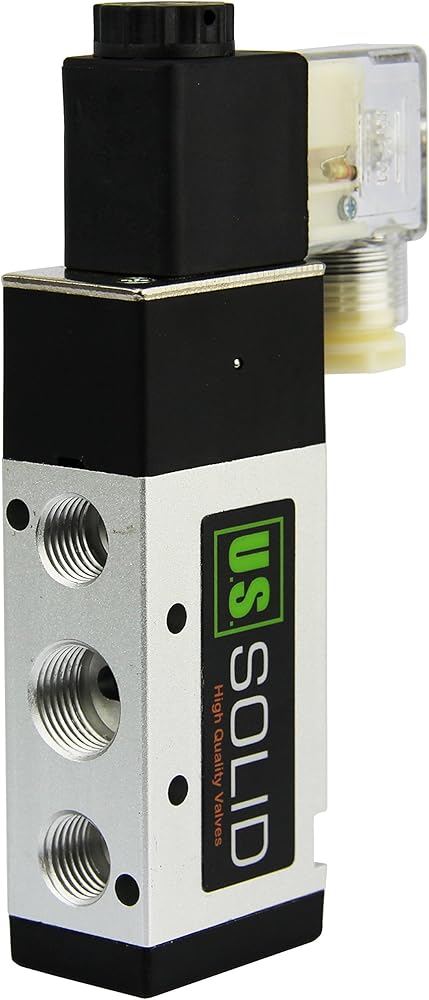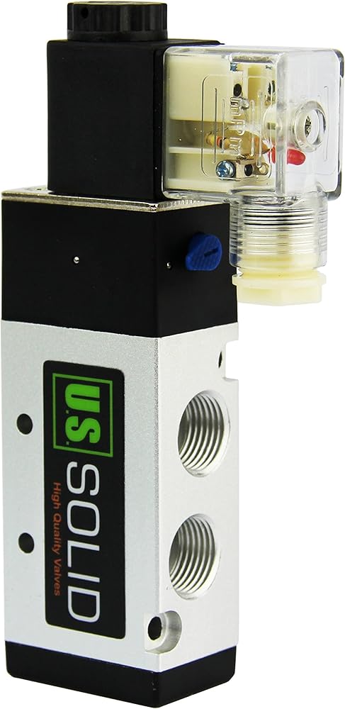 The U.S. Solid 3/8" NPT 5 Way 2 Position Pneumatic Aluminum Electric Solenoid Valve is a switch for routing air to any pneumatic device, usually an actuator, allowing a relatively small signal to control a large device. It is also the interface between electronic controllers and pneumatic systems. This valve allows pneumatic control of position, flow, pressure and temperature. This is a 5/2 valve which means it has 5 ports; 2 exhaust ports through which air is regulated as it flows out, 2 power ports that power the system, 1 supply port for the inlet of air pressure, and 2 flow positions. This valve is made with an aluminum alloy and has an aperture of 3/8” NPT. Pneumatic types of valves can be found in a wide array of industries. Aircrafts use pneumatic valves to control the pressure and flow of hot engine air to the windshield for the anti-icing and rain removal. Food and beverage manufacturers use them to make, dispense or preserve food and beverage products. U.S. SOLID pneumatic valves offer reliability, low power consuming, and long life. They have prewired connections which makes installation, maintenance, and control simple.