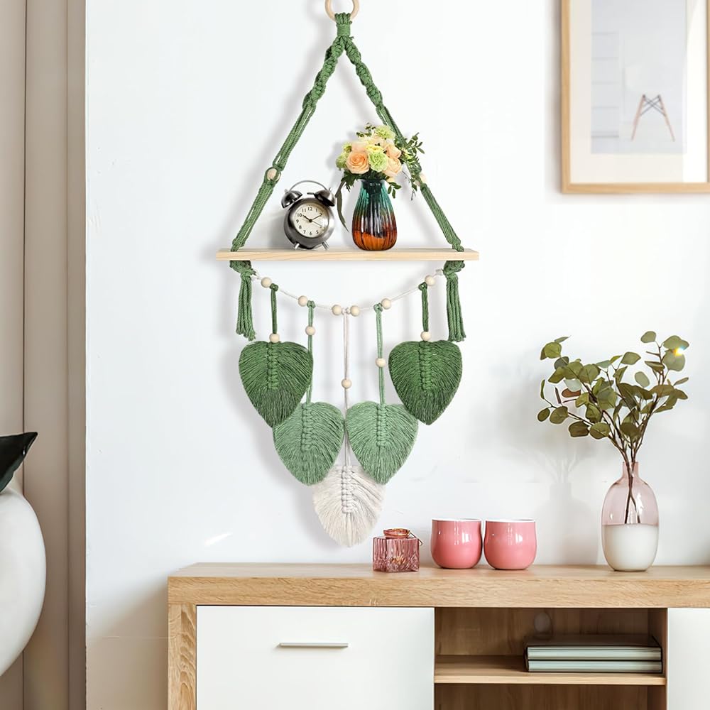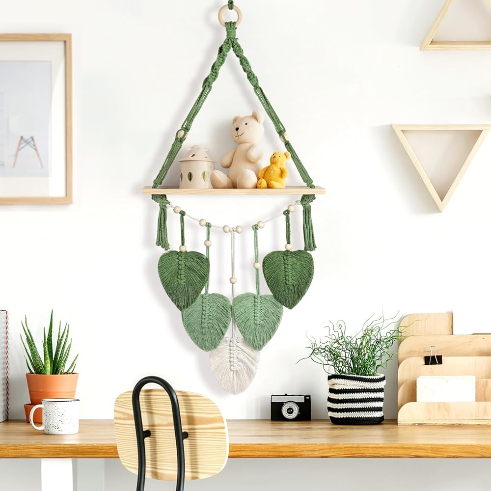 رف معلق على الحائط من Macrame رف تخزين عائم من الخشب بوهو منسوج على شكل أوراق شجر لتزيين الحائط شماعات نباتية لعرض الصور وغرفة النوم وغرفة المعيشة وديكور الحضانة