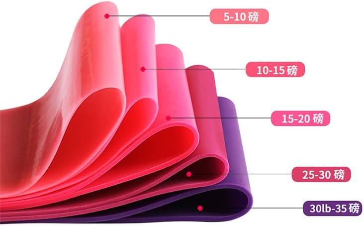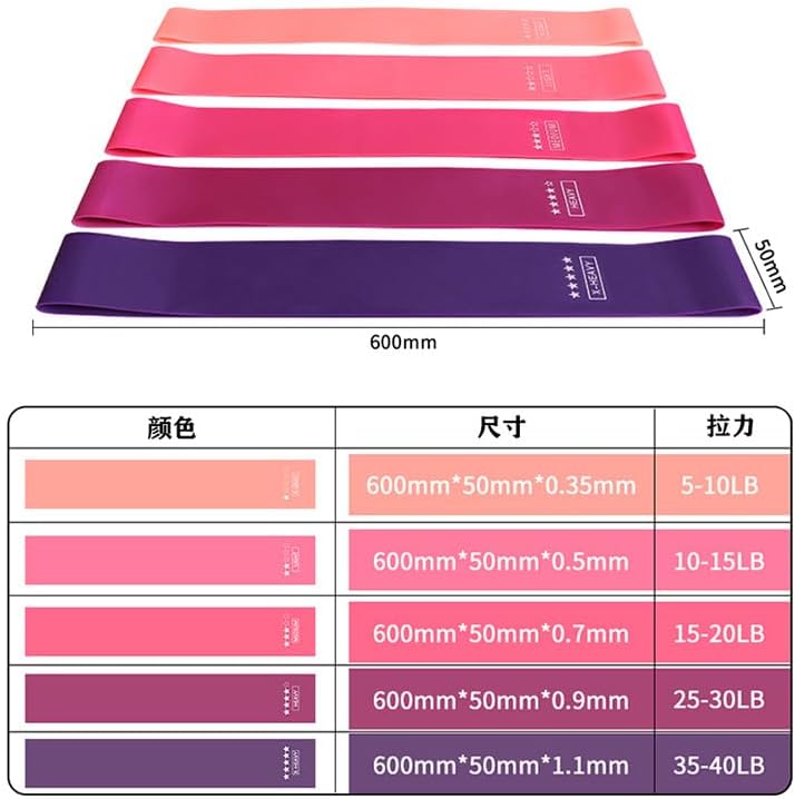Include 5 colored resistance bands X-light (10 lbs), Light (15 lbs), Medium (20 lbs), Heavy (30 lbs), X-heavy (35 lbs).