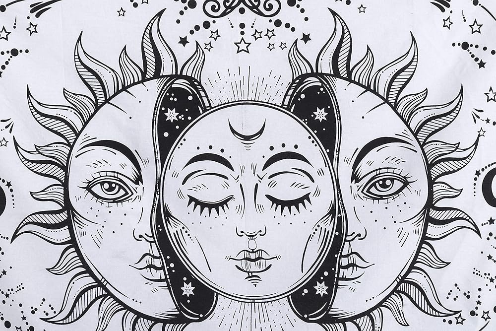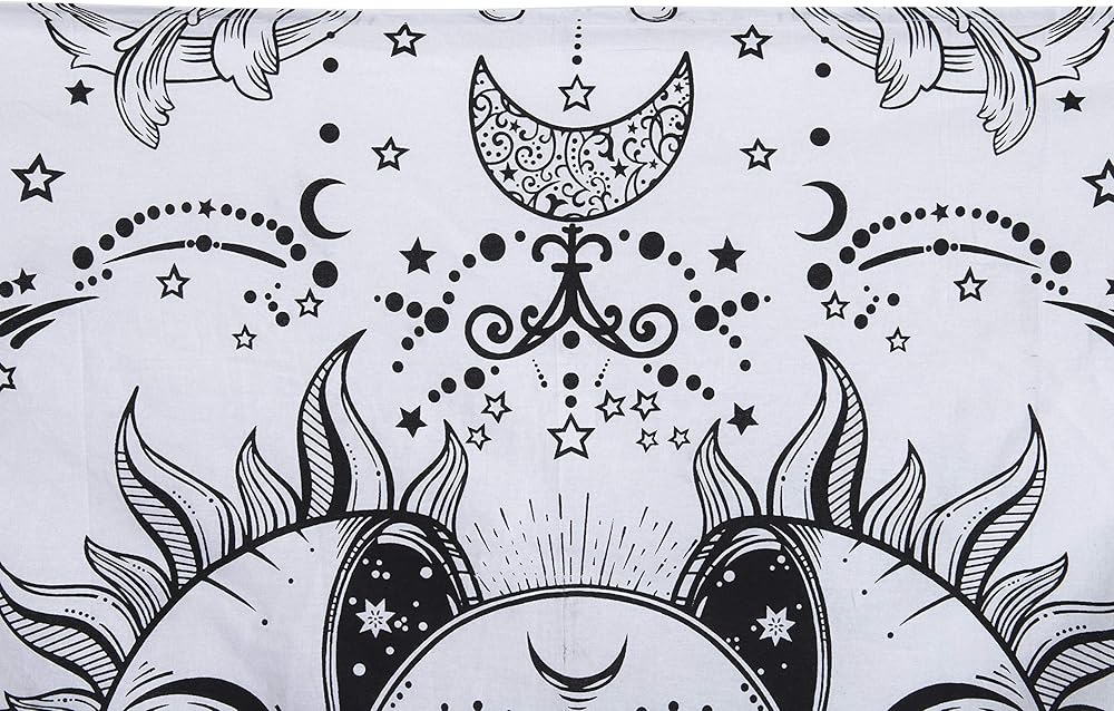 تم تصميم النسيج الغامض والمخدر مع الشمس المحروقة والنجوم المبهرة والقمر والصور الغامضة، ومطبوع بطباعة الشاشة الهندية وصبغة ربطة عنق متعددة الألوان. اجعل غرفتك ومنزلك مليئين بالغموض والمخدر.
