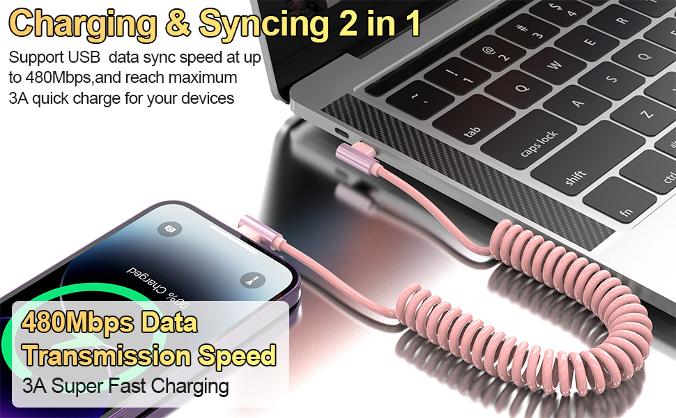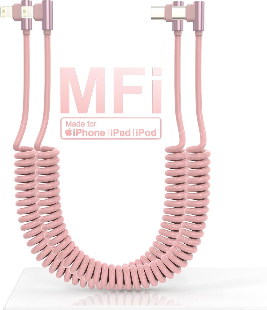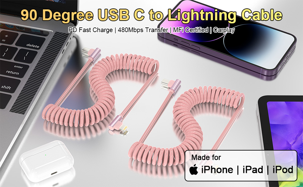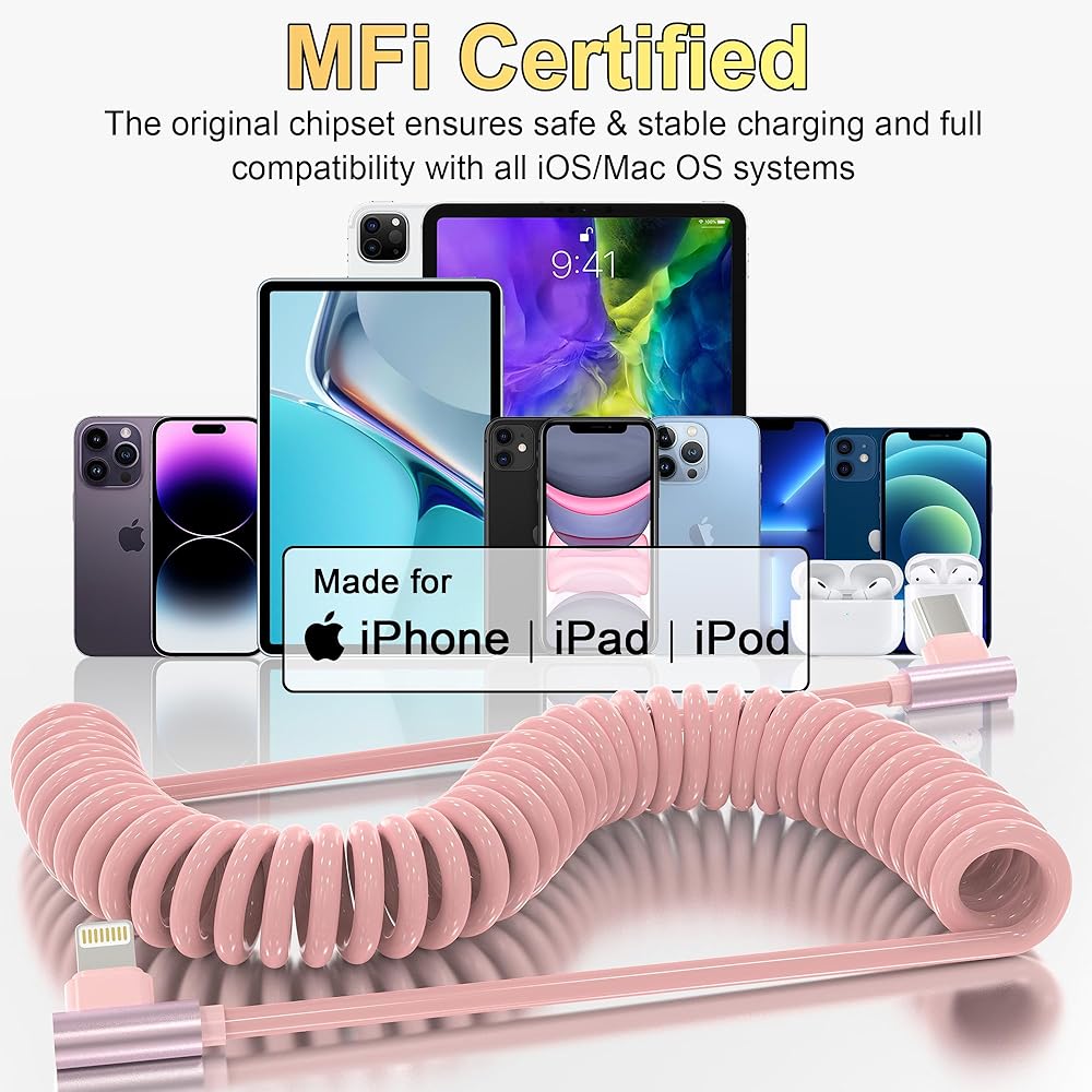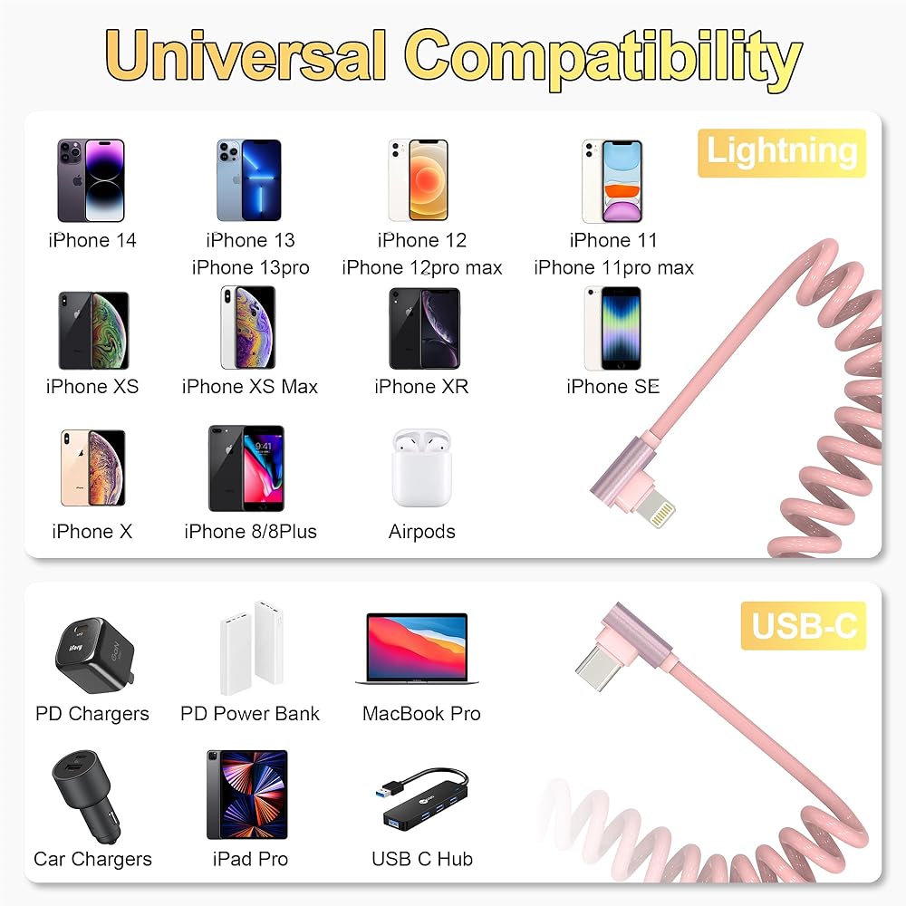 توافق واسع: كابل شحن iPhone ملفوف قابل للسحب متوافق مع جميع موديلات iPhone، مثل iPhone 14/13/iPhone 12 Pro Max/iPhone 12 Pro/iPhone 12/iPhone 12 mini/11/Xs/XR/X/SE/iPhone 8 /7/6/5. متوافق أيضًا مع أجهزة iPad وAir-Pods.