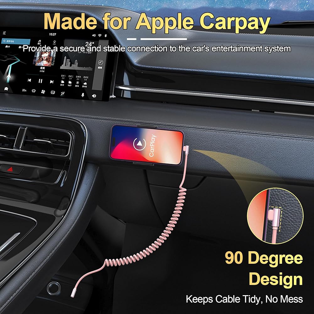 كابل USB C إلى Lightning ملفوف 90 درجة، قطعتان، كابل شاحن USB C Apple Car Play [معتمد من Mfi ومزامنة البيانات]، كابل Lightning قصير قابل للسحب PD 20W USB C للسيارة لأجهزة iPhone/Pad/Pod