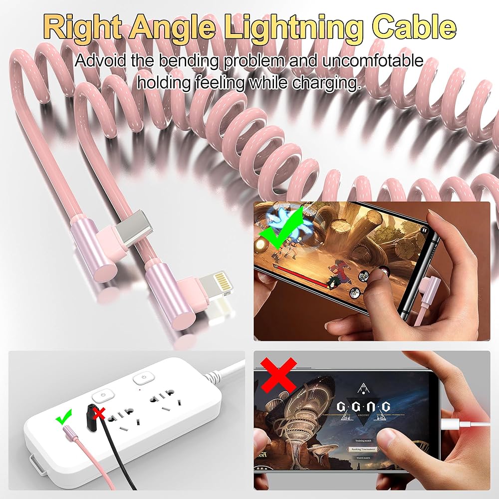 90 زاوية يمين لايتنينج USB C ملفوف: مرفق لسهولة الوصول يتميز بتصميم مبتكر للكوع لمنع تلف الكابل حتى تتمكن من حمل هاتفك بشكل مريح للألعاب والتصفح أثناء شحن هاتفك. يمكن للواجهة المثالية التي تبلغ 90 درجة حماية إضافية واجهة الجهاز، وتجنب ثني كابل البيانات وكسره، وإطالة عمر الخدمة.