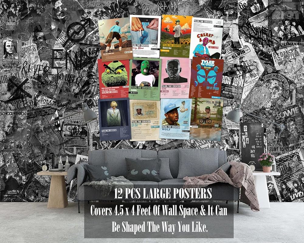 • 🎵 مجموعة ملصقات Tyler The Creator المميزة: انغمس في عالم Tyler The Creator مع هذه المجموعة الحصرية المكونة من 12 ملصقًا، مقاس كل منها 12 × 16 بوصة، تلتقط لحظات لا تُنسى من حياته المهنية.
