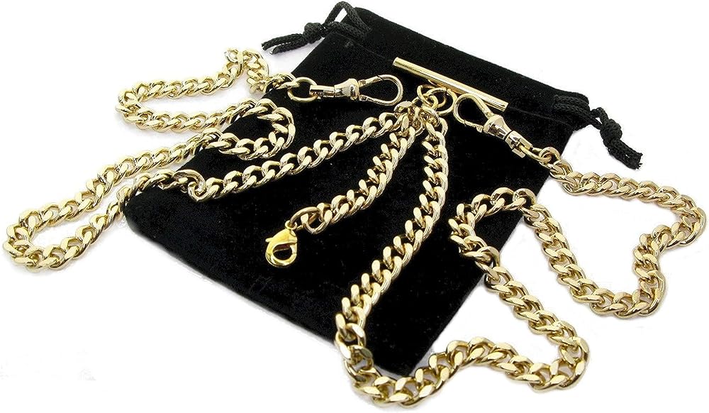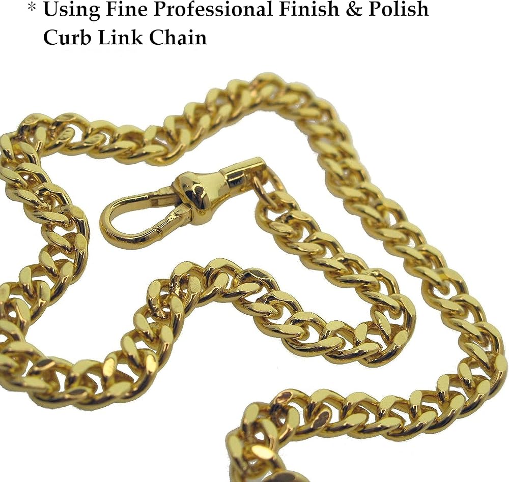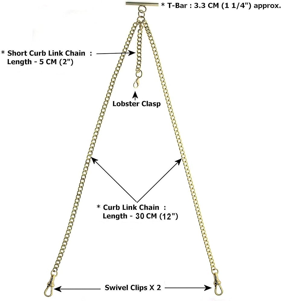 • 100% Brand New GOLD Color Curb Link Albert Chain with T-Bar & with 2 Swivel Clasps + Lobster Clasp on Drop