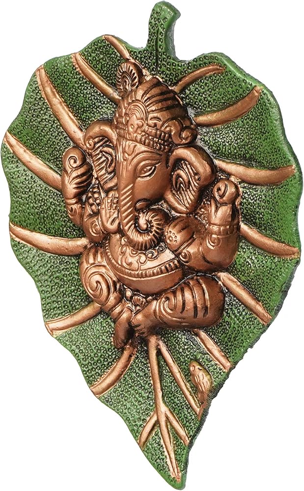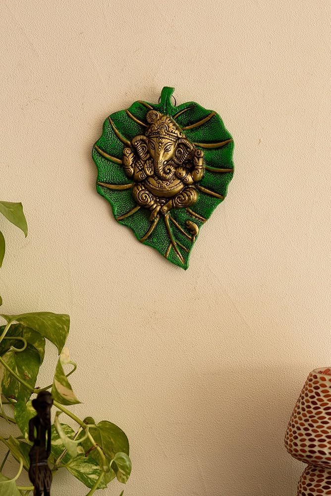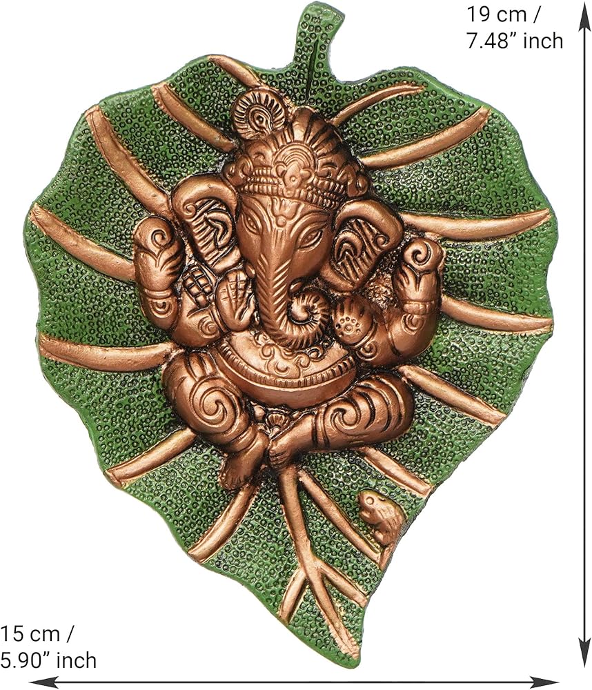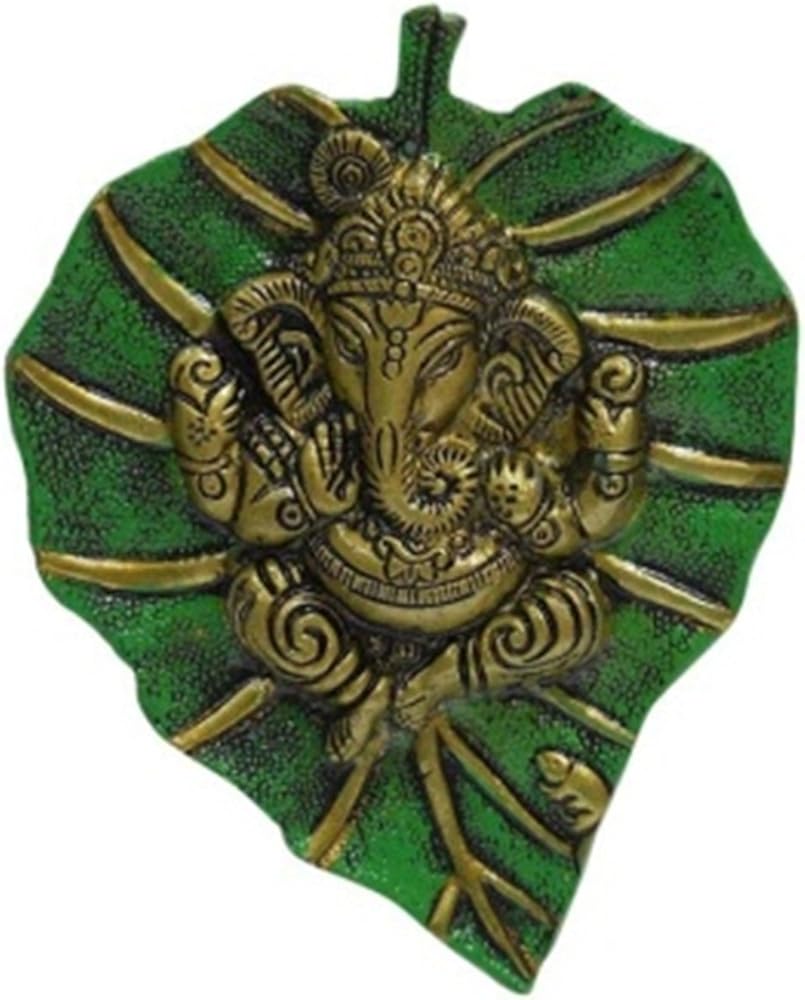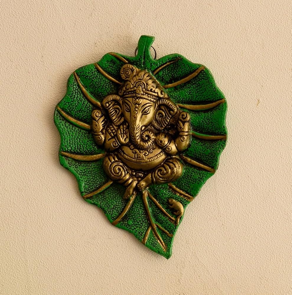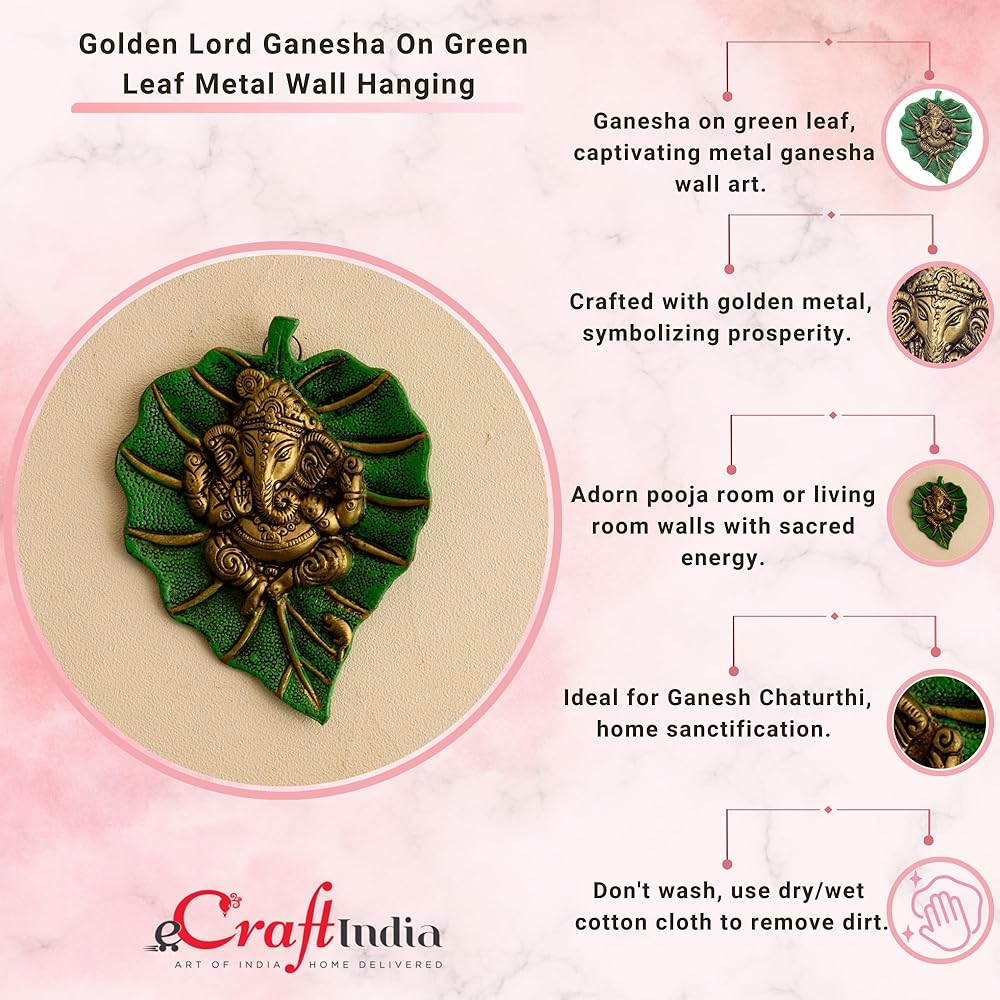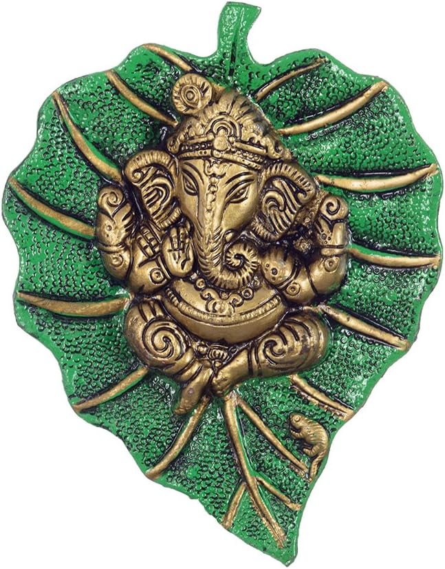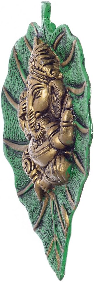 This beautiful wall hanging Ganesha on green leaf from eCraftIndia will definitely bring in a divine serenity to your home decor. It is crafted from German silver which ensures and ethnic look as well as durability. This art piece is surely grab attention in your living room. It serves as a great gift, especially around religious celebrations and festivities. Each wall hanging is diligently handcrafted by skilled artisans from the house of eCraftIndia using various traditional technique