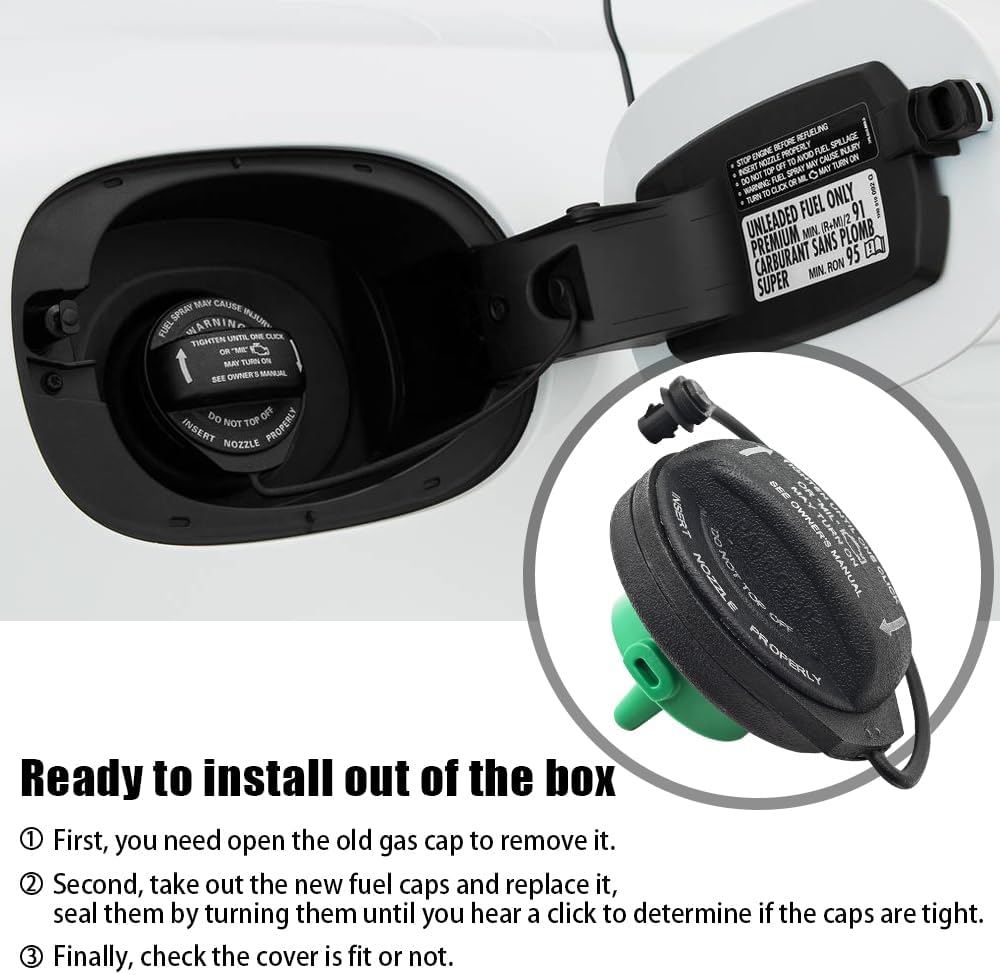 Easy to install and no special tools required. Just remove the old fuel filler cap and replace this new fuel caps, seal them by turning them until you hear a click to determine if the car caps are tight.