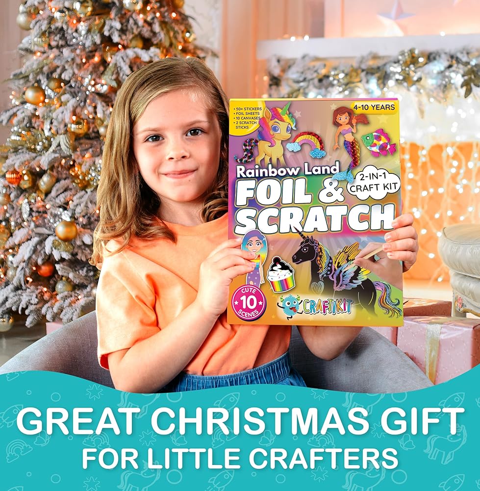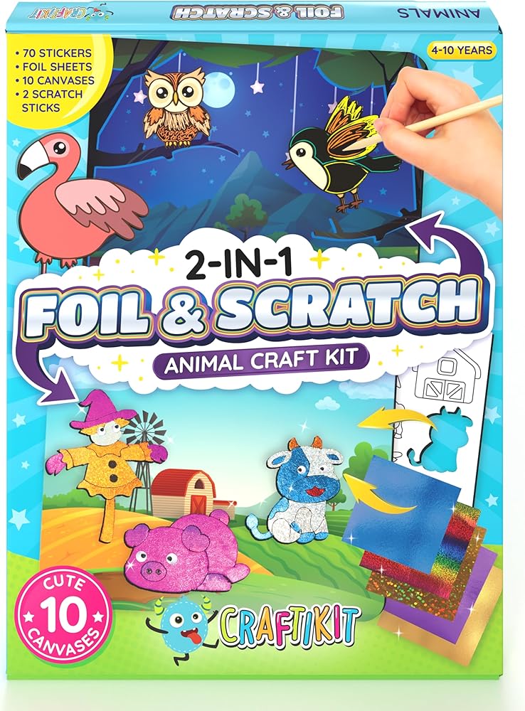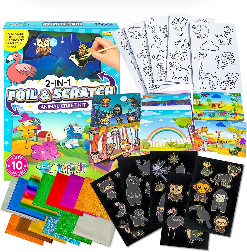 Craftikit ® فن رقائق الحيوانات وفن خدش قوس قزح للأطفال - مجموعة الفنون والحرف 2 في 1 للأطفال الذين تتراوح أعمارهم بين 4 و10 سنوات - هدايا للفتيات والفتيان والأطفال الصغار الذين تتراوح أعمارهم بين 4 و5 و6 و7 و8 و9 و10 سنوات