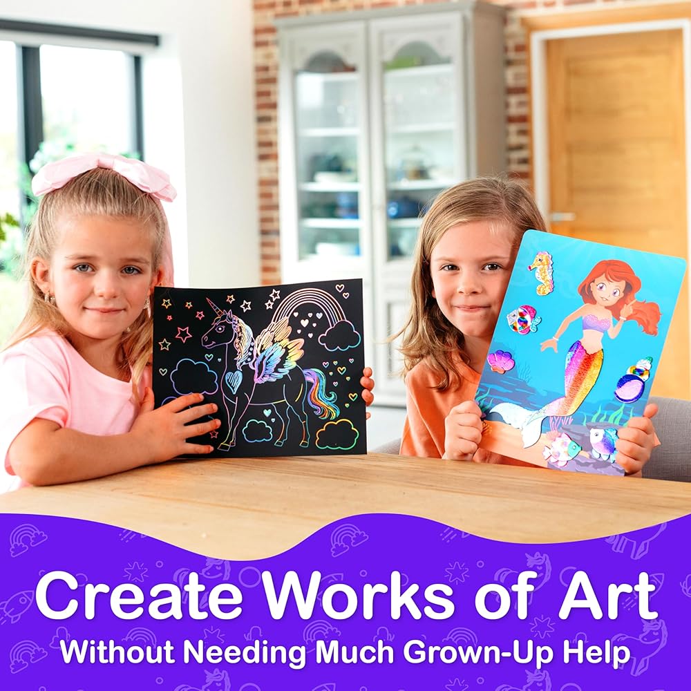 • مرضية وبسيطة: ملصقات الرقائق المعدنية ممتعة بشكل لا يصدق للأطفال (والكبار)، ويحتوي ورق الخدش الفني على عنصر كشف مفاجئ، مما يعني أن هذه أنشطة للأطفال يسهل الانتهاء منها، ولا تنسى!