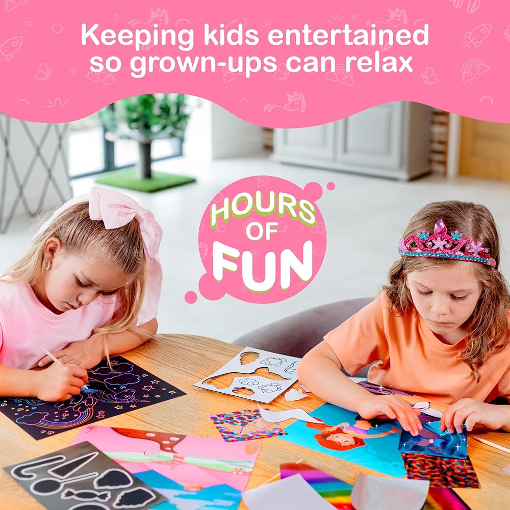 • حرف 2 في 1: تتضمن مجموعة الفنون والحرف اليدوية نشاطين مختلفين في صندوق واحد، مما يعني أن أطفالك الصغار لن يشعروا بالملل من حرفة واحدة متكررة. اختر بين حرفة رقائق معدنية ممتعة أو ورق خدش بألوان قوس قزح لإبقائهم مستمتعين لساعات!