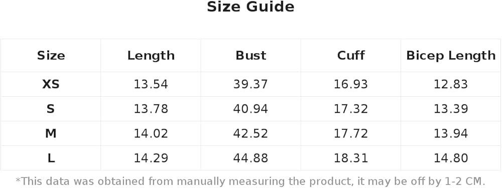 XS:Bicep Length:12.8IN,Bust:39.4IN,Cuff:16.9IN,Length:13.5IN
