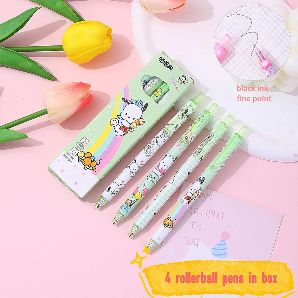 ⭐4 pcs of kawaii retractable rollerball pens of different patterns. Features 0.5mm point, black ink, smooth writing.
