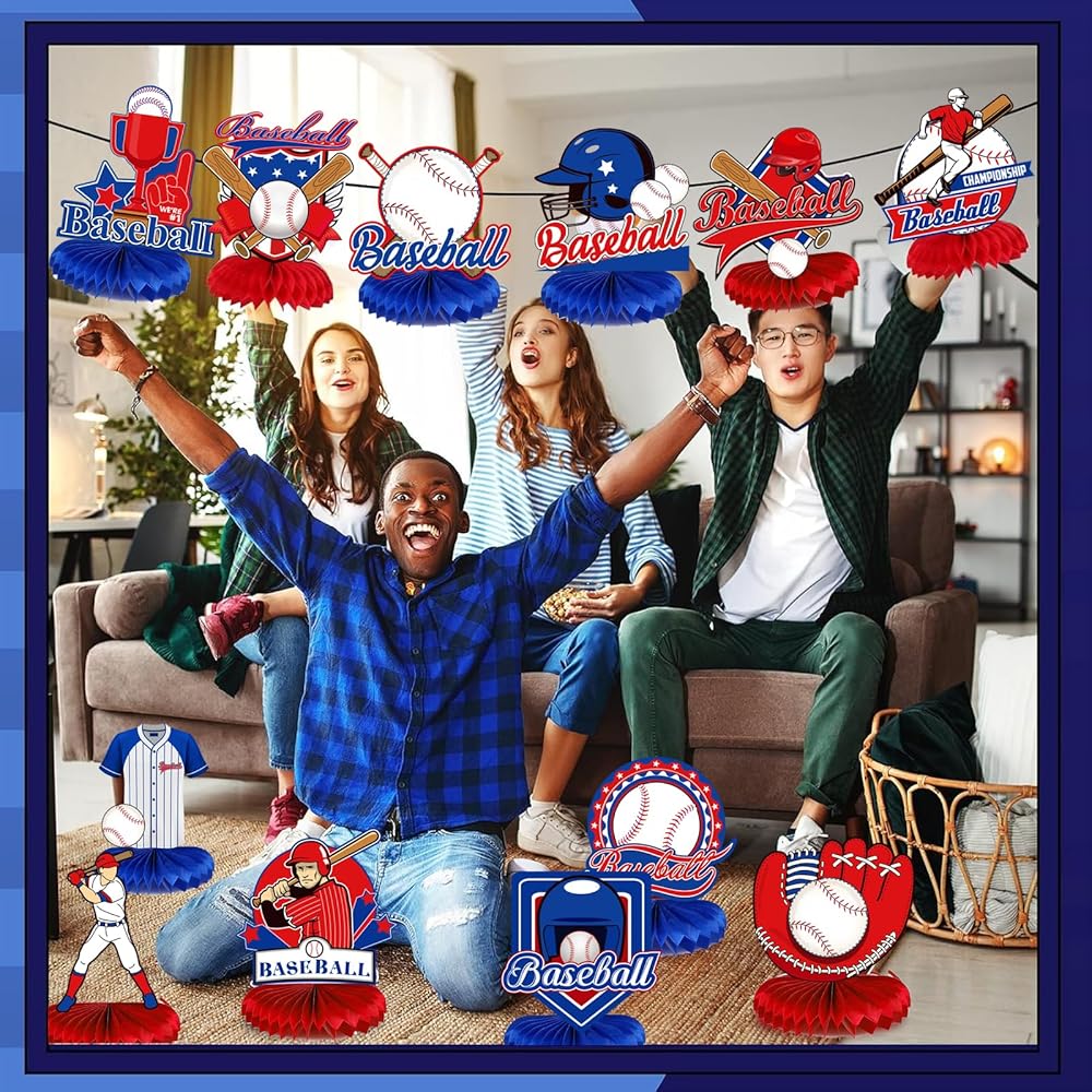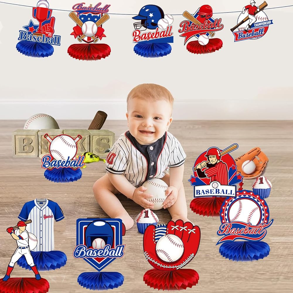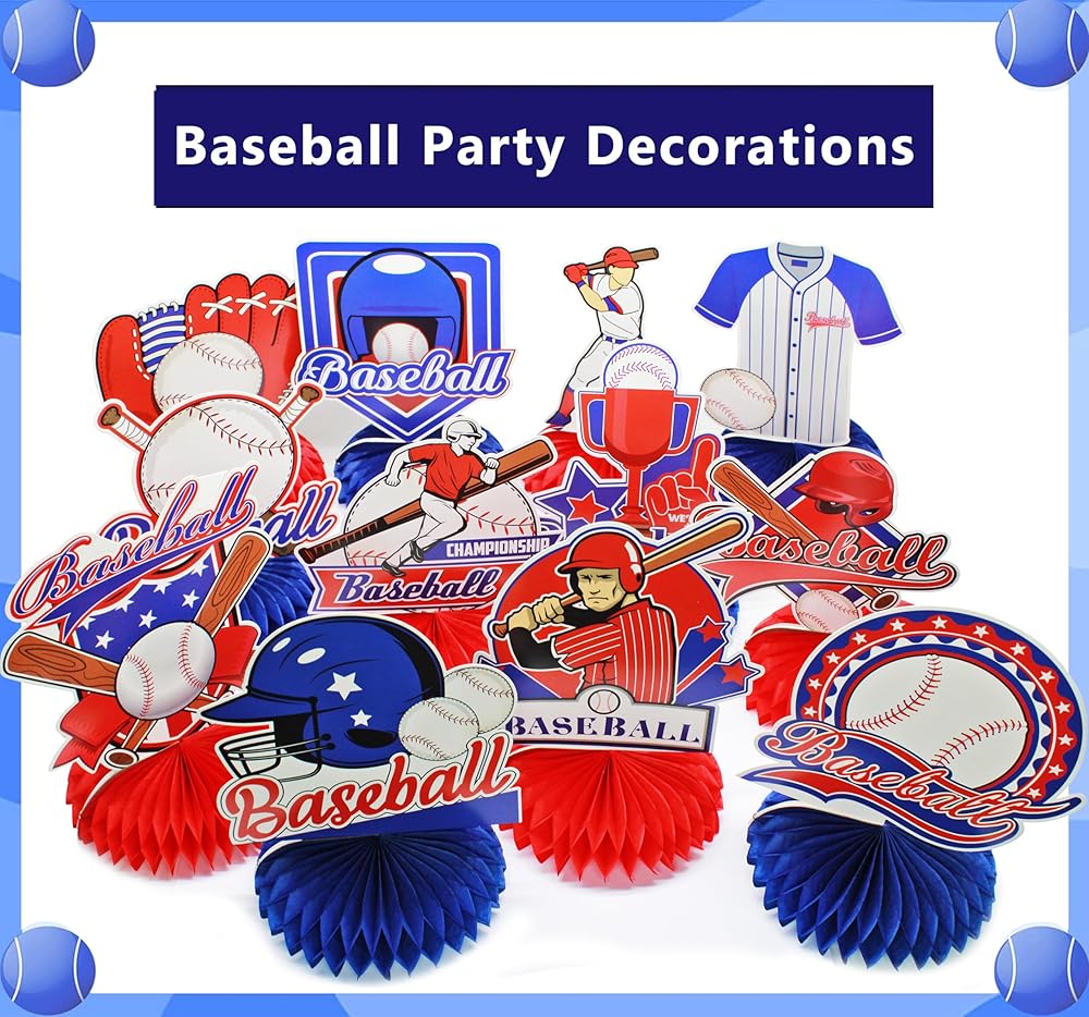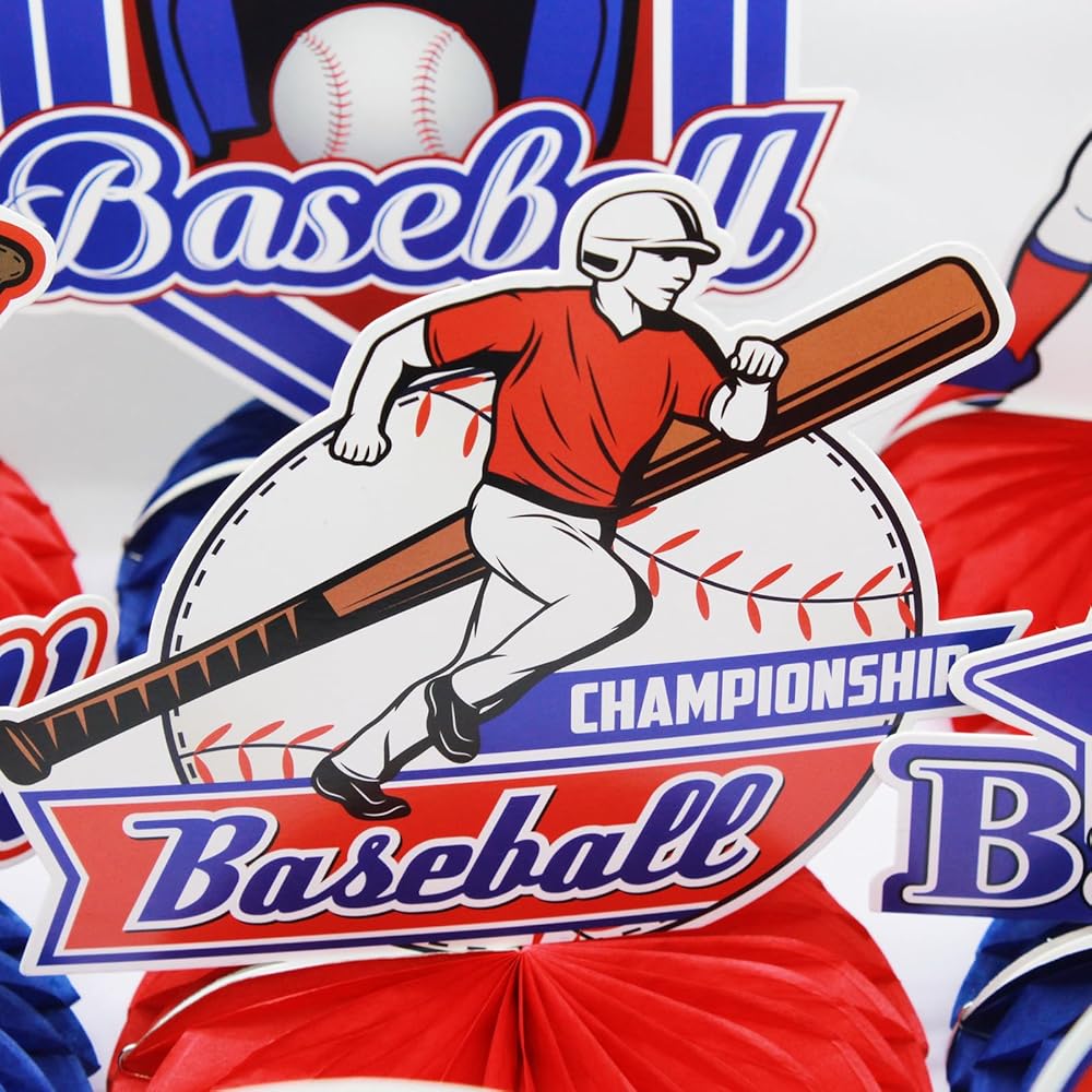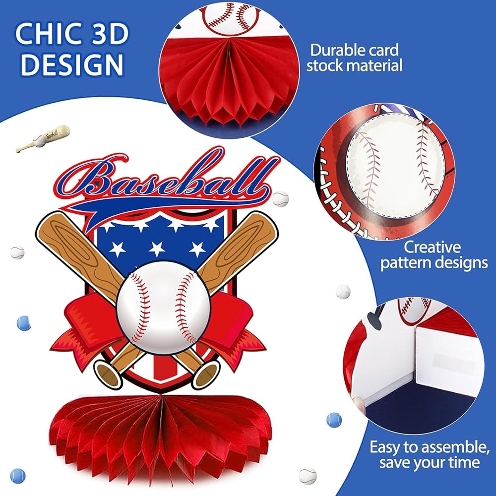 زينة حفلة عيد ميلاد البيسبول، 12 قطعة من قطع البيسبول المركزية على شكل قرص العسل لتزيين طاولة البيسبول للأطفال الأولاد البيسبول البيسبول باللونين الأزرق والأحمر، لوازم حفلات استقبال المولود الجديد