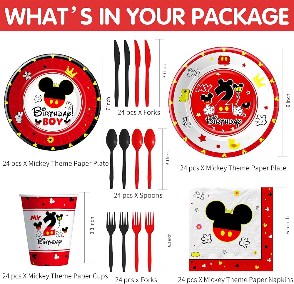 【Package Included】Our Mickey 2nd birthday party tableware decorations included 24pcs 9'' mickey dinner plates, 24pcs 7'' mickey dessert plates, 24pcs napkins, 24pcs cups, 24pcs disposable cutlery, for mickey theme two year old birthday party supplies