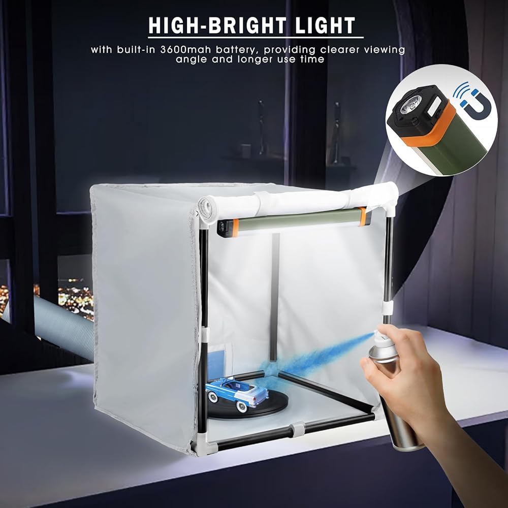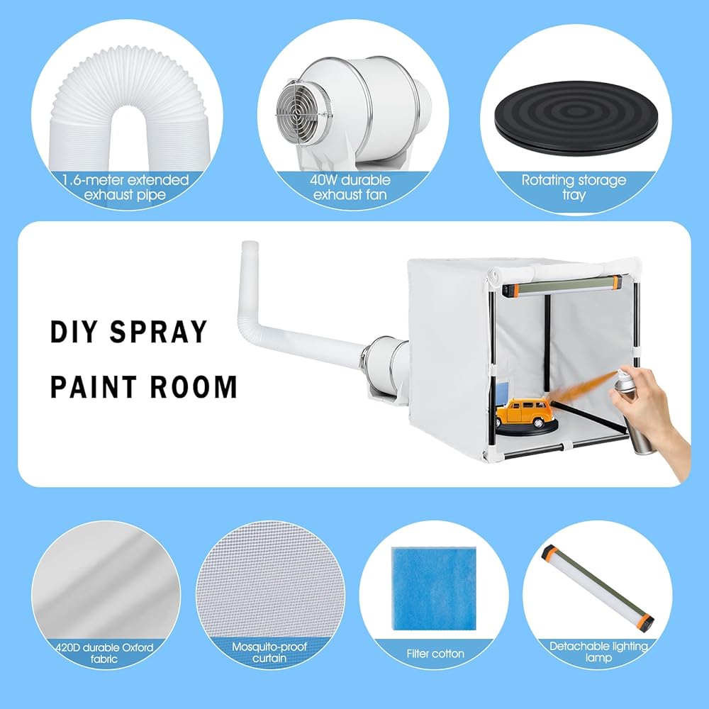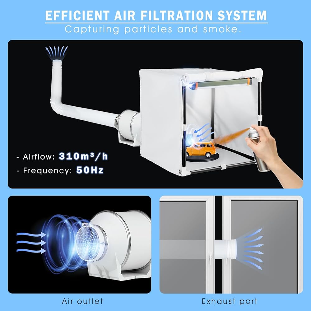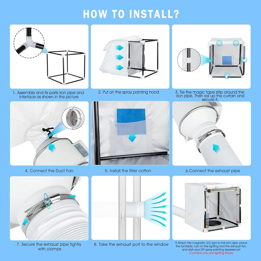 【دوران وإضاءة مرنة】يحتوي الكشك على قرص دوار مقاس 7.8 بوصة، مما يسمح بتشغيل المشاريع للحصول على تغطية كاملة أثناء الطلاء. وهي مجهزة بضوء LED مغناطيسي قابل للفصل بقدرة 3600 مللي أمبير في الساعة، مما يضمن إضاءة مساحة العمل جيدًا. خرطوم تمديد مروحة العادم يمكن تمديدها من 16 بوصة إلى 5.3 قدم (63 بوصة). تضيق نهاية خرطوم التمديد إلى بوصة واحدة، مما يسمح بوضعه وتأمينه في فجوة النافذة أو فجوة الباب، مما يؤدي إلى تنفيس العادم إلى الخارج.