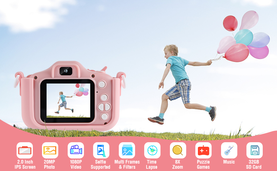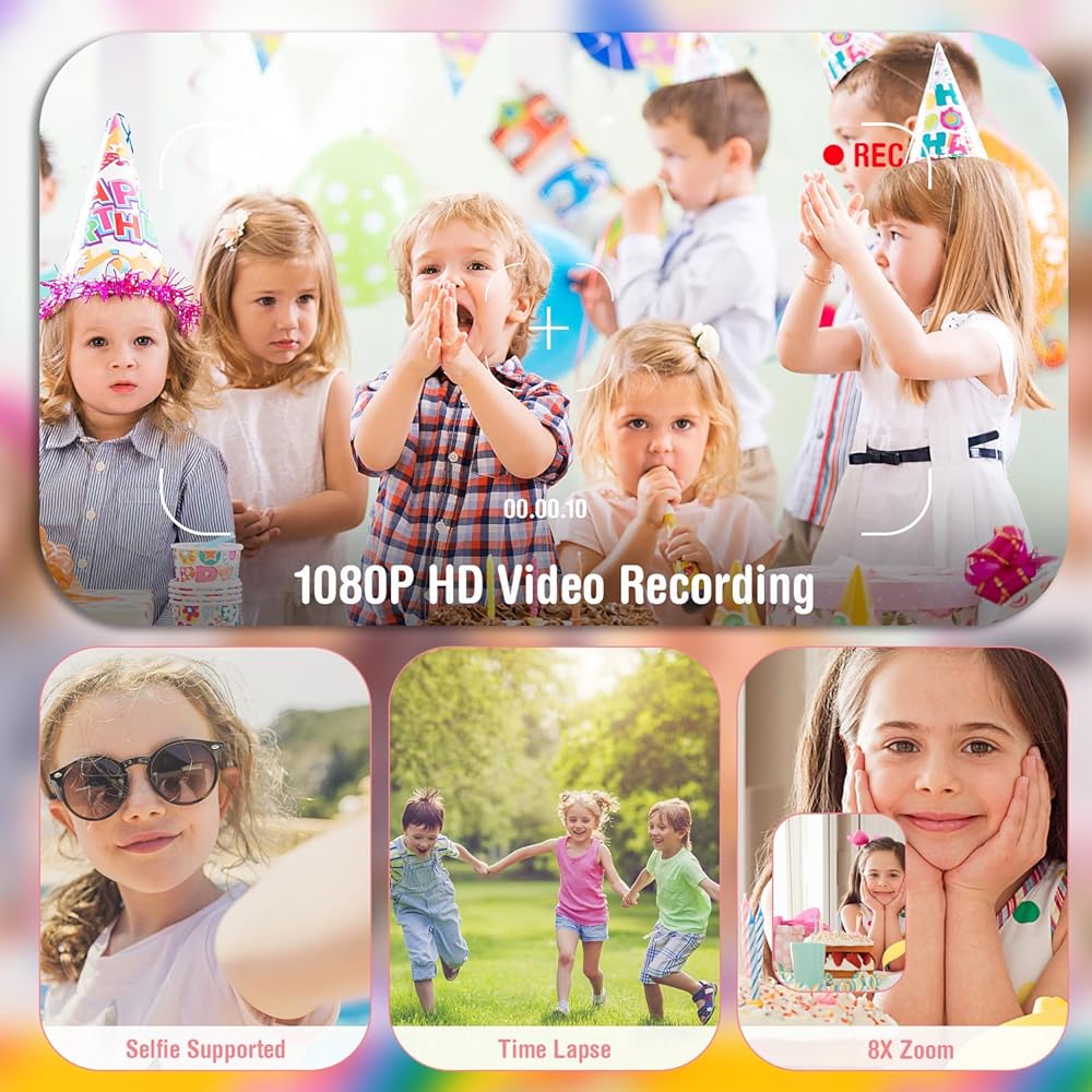 💙 【تسجيل أكثر وضوحًا واختيارات متعددة المشاهد】- مجهزة بتركيز تلقائي و8.0 ميجابكسل وفيديو 1080 بيكسل، تعمل هذه الكاميرا على تحسين تعريف الصور بشكل كبير. إنه يلتقط لحظات رائعة للفتيان والفتيات. مع ميزة التقاط الملصقات ذات الرأس الكبير، يمكن للأطفال التقاط صور بإطارات وإنشاء صور مرحة مع أسرهم أو أصدقائهم.