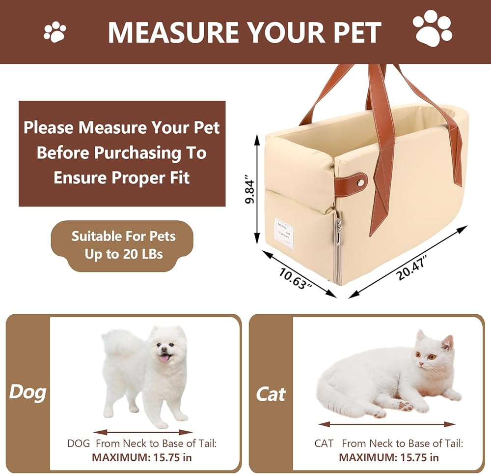 • [Perfect For Small Pets] Exterior dimensions-20.47 x 10.63 x 9.84 in (52 x 27 x 25 cm). Interior dimensions-16.93 x 7.87 x 9.45 in (43 x 20 x 24 cm). Recommended for small dogs weighing 20 pounds or less and maximum length ≤ 15.75 inches (40 cm), as well as cats. The maximum back length your pet can lie down on is less than 13 inches (33 cm), so please measure the length of your pet's back and the length of your car's center console before purchasing.