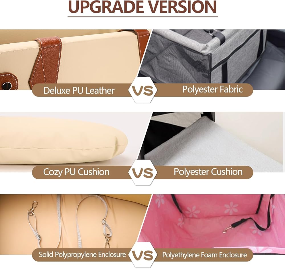 • [Upgraded Console Dog Car Seat] The upgraded center console dog car seat and shoulder straps are made of high-quality imported PU leather and real microfiber leather materials respectively.At the same time, it has a texture and color similar to real leather. Compared with other leathers, this leather is your best choice, giving you a simple, high-end fashion, and elegant feeling and experience.