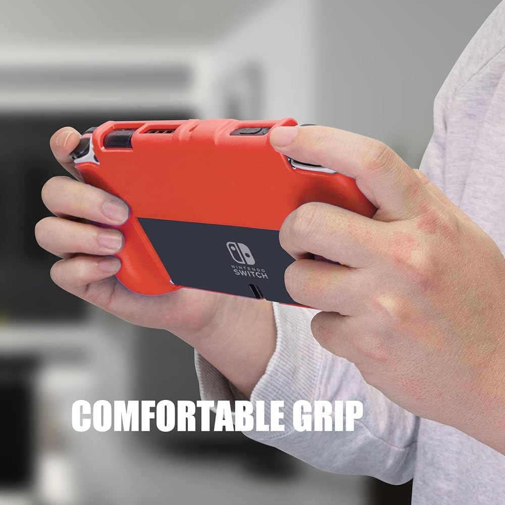 حافظة Switch OLED Grip - تتميز حافظتنا بمقابض في الخلف تجعل من الأسهل والأكثر راحة حمل جهاز Switch OLED الخاص بك، سواء كنت تلعب أثناء التنقل أو في المنزل.