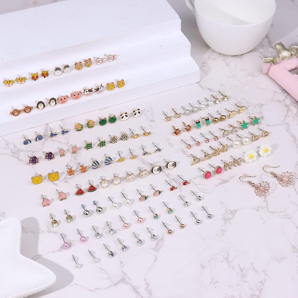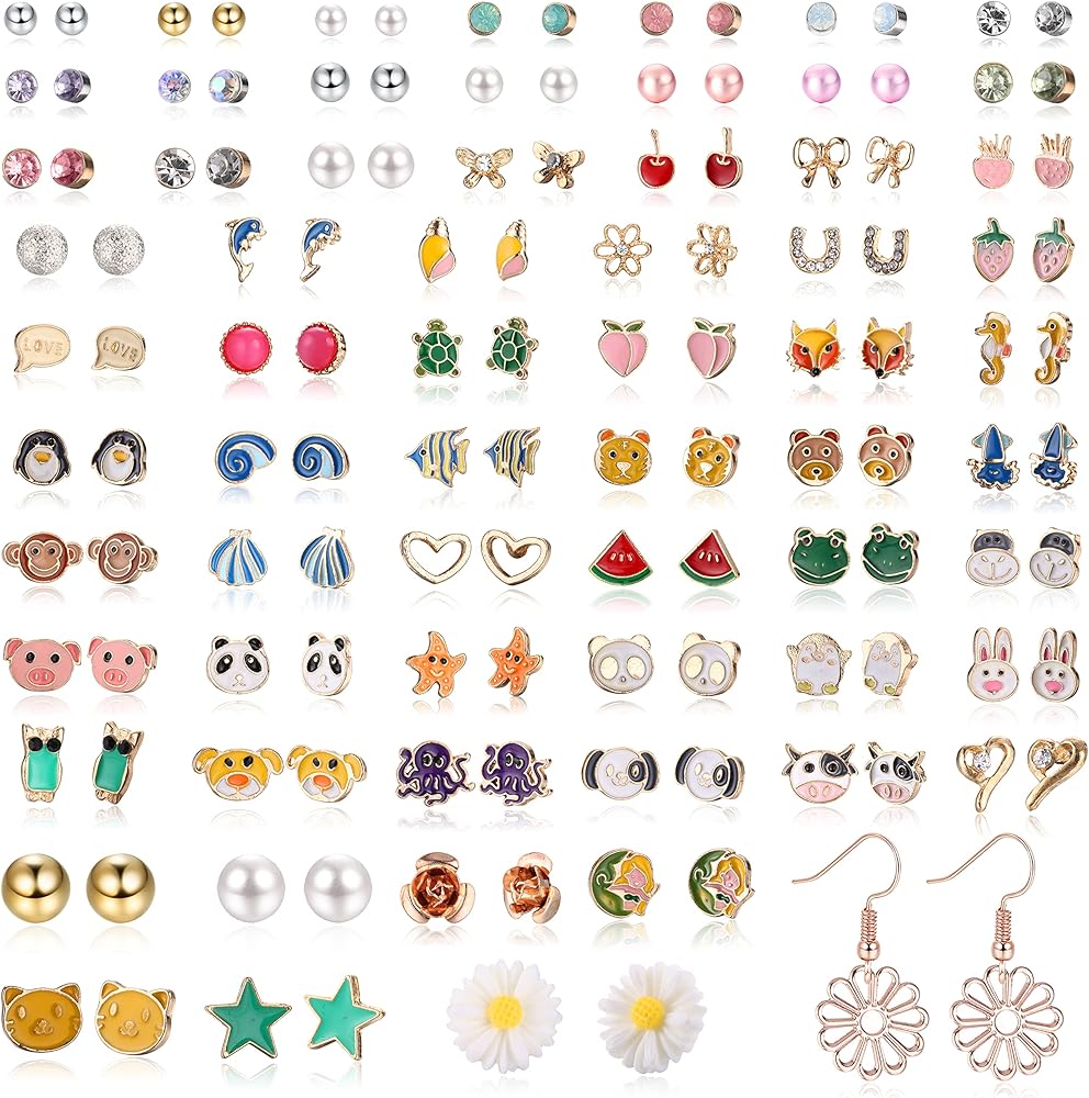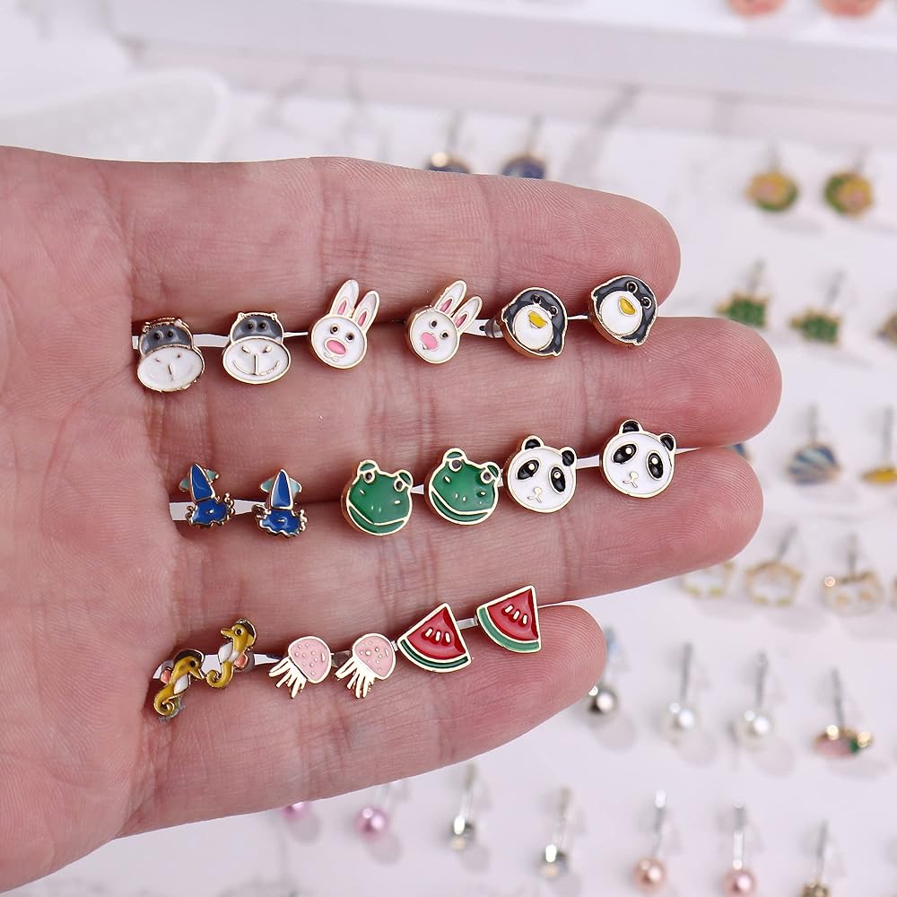 Subiceto 65 زوجًا من الأقراط المصنوعة من الفولاذ المقاوم للصدأ للنساء مجموعة متنوعة من الأقراط اللطيفة على شكل حيوان ثعلب الباندا والفواكه وزهرة مختلط الألوان