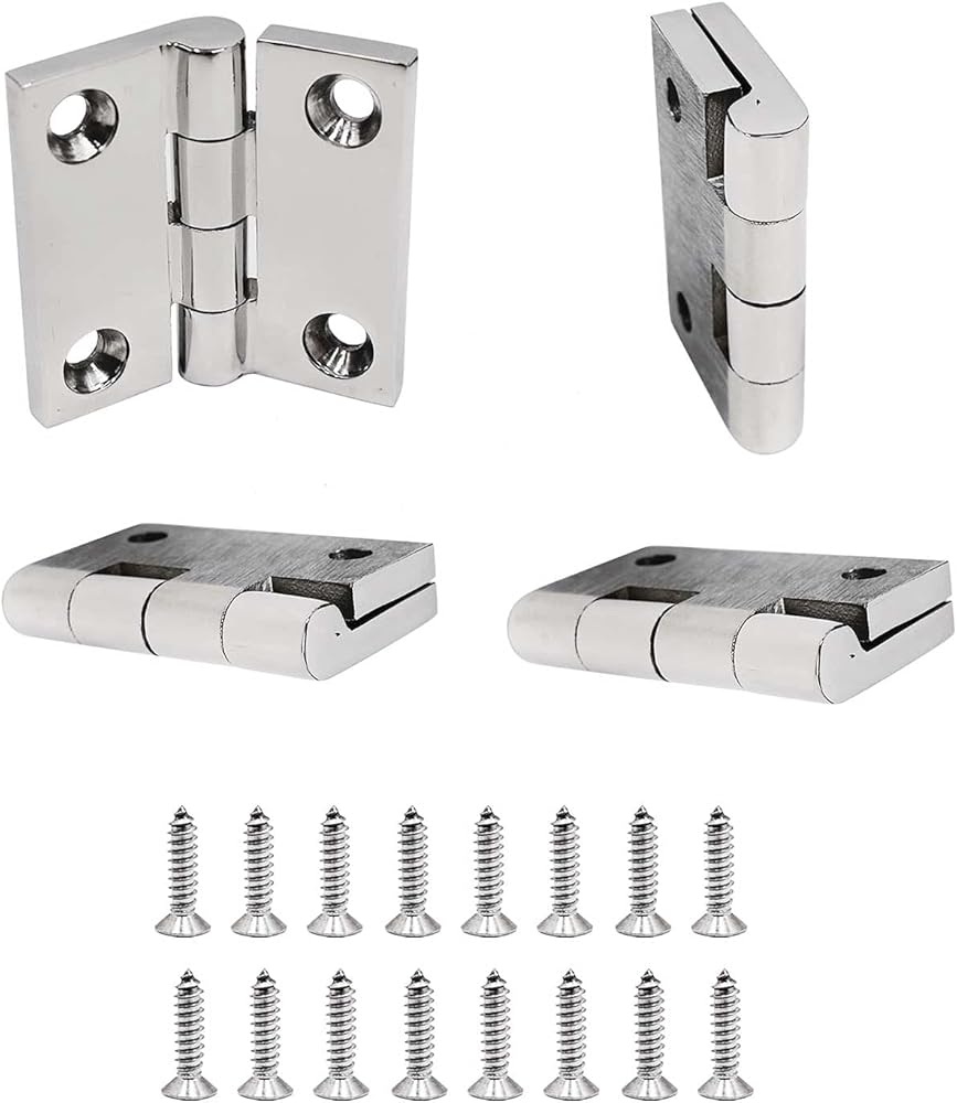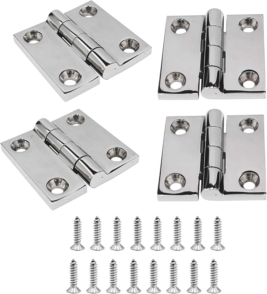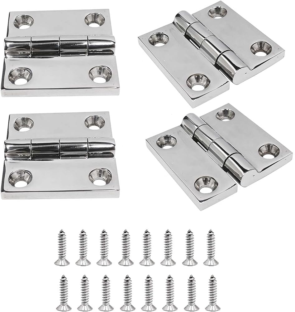 Package Includes:4 pieces of 1.5" x 1.5" Strap Hinge Door Hinge (stainless steel 316) ,16 pieces 4.8 x 19 mm screws (stainless steel 316).
