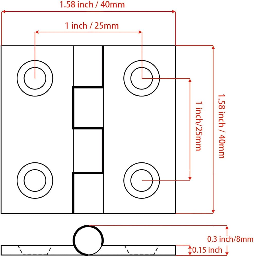 Boat Hinge L x W :1.5" x 1.5" (40 x 40 mm). Thickness:Approx.0.15 inch (3.8 mm) Door Hinge.(Please see the left picture for specific size).