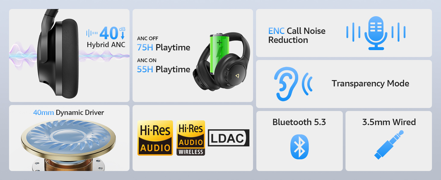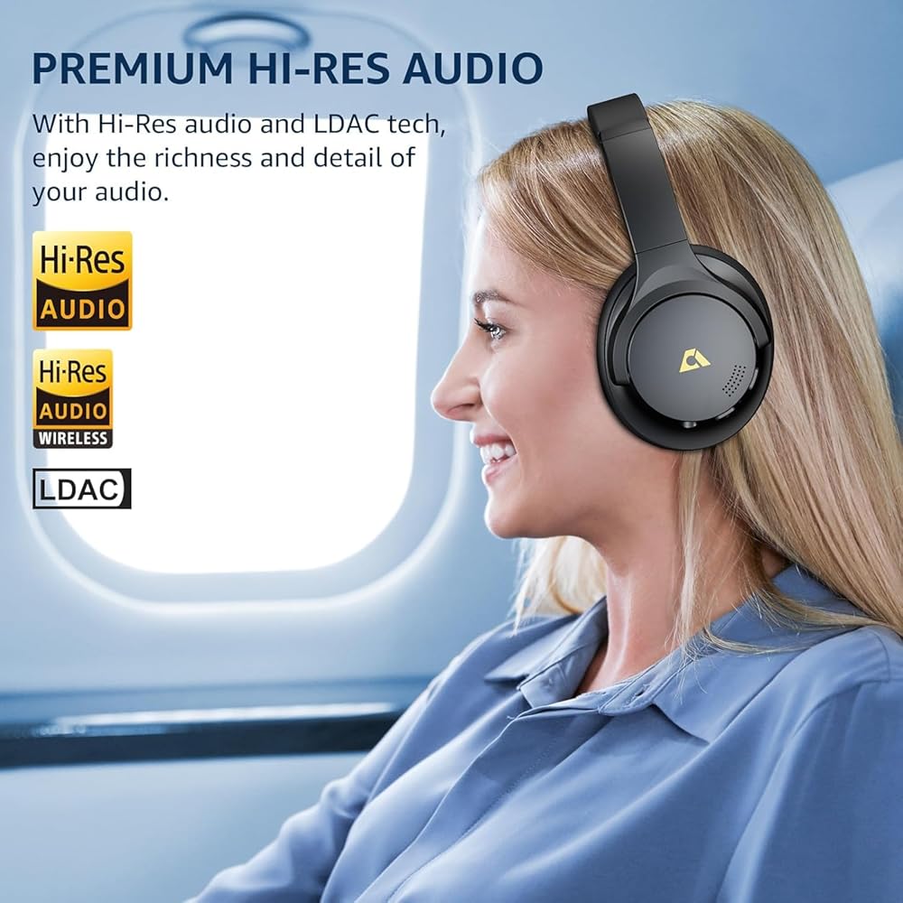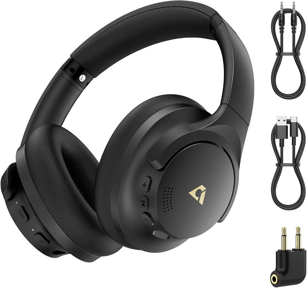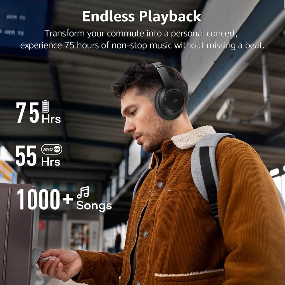 75 Hours Playtime: Enjoy up to 55 hours of music in ANC mode, or extend the playtime to 75 hours in standard mode. When traveling, a 10-minute quick charge can play for 5 hours, or use a 3.5mm audio cable for wired connection. When on the plane, you can use the headphones through the included airplane adapter.