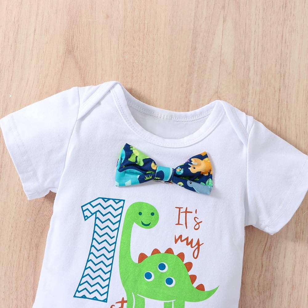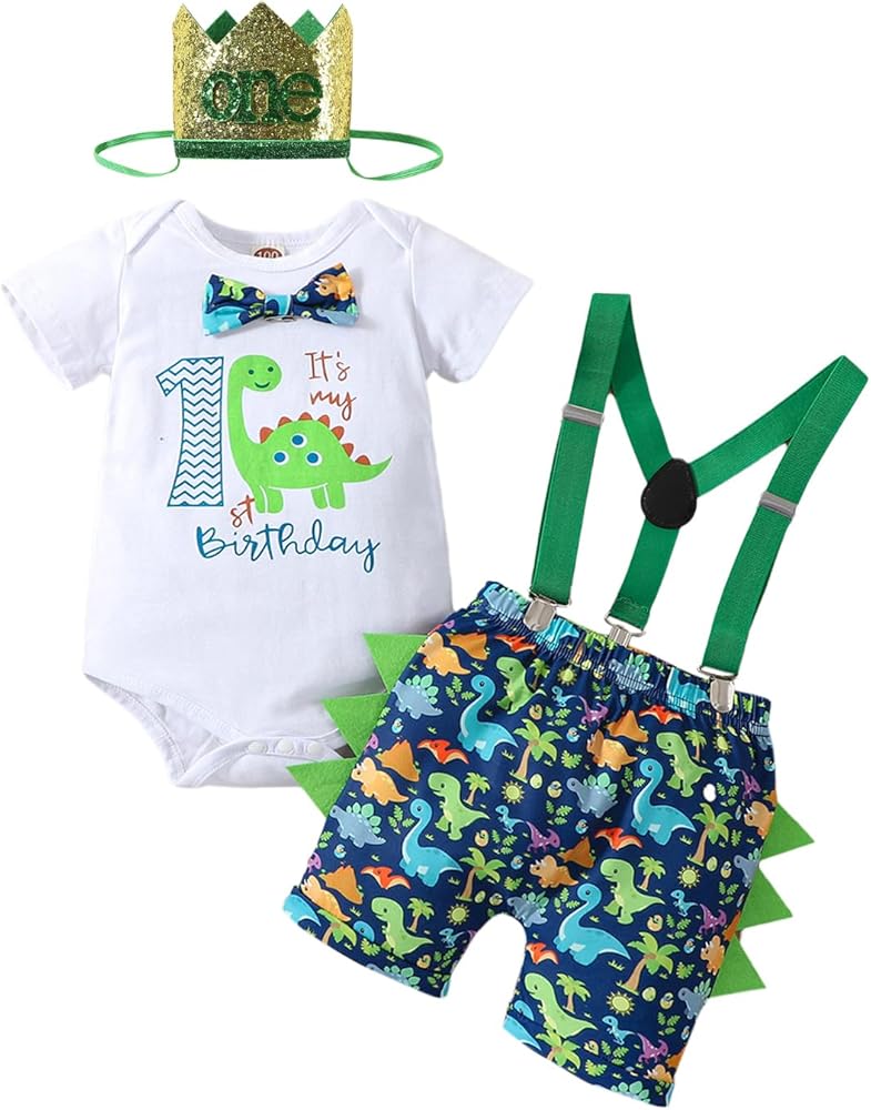 زي سماش كعكة عيد الميلاد بعمر عام واحد: فستان طفل رضيع نبيل لعيد الميلاد الأول على شكل ديناصور، وأكمام قصيرة/طويلة ورقبة دائرية مخيطة بربطة عنق، يجعل طفلك مثل الرجل الصغير، وهو مناسب جدًا لعيد ميلاده الأول حفلة تحطيم الكعكة. تحتوي البدلة على أزرار كبس عند الحوض لسهولة الارتداء وتغيير الحفاضات.
