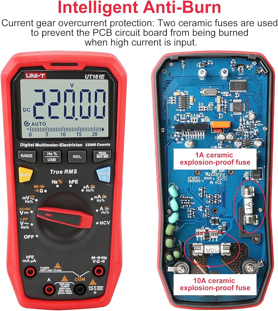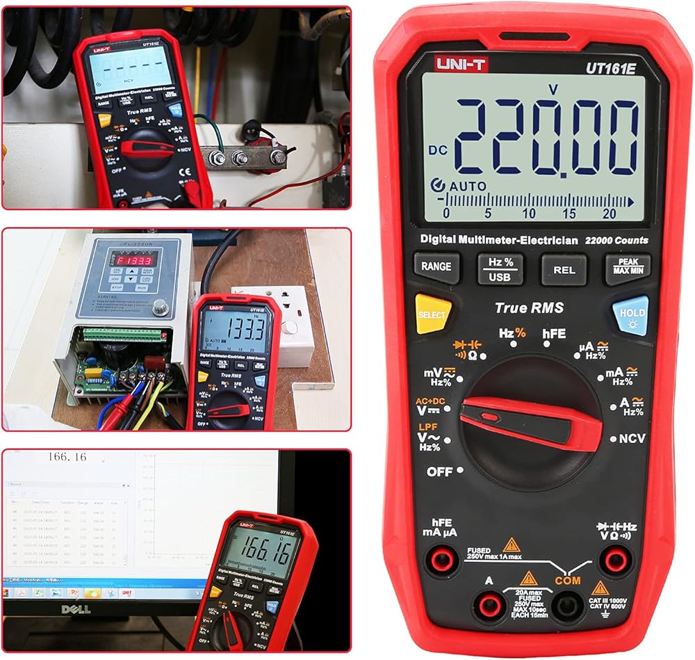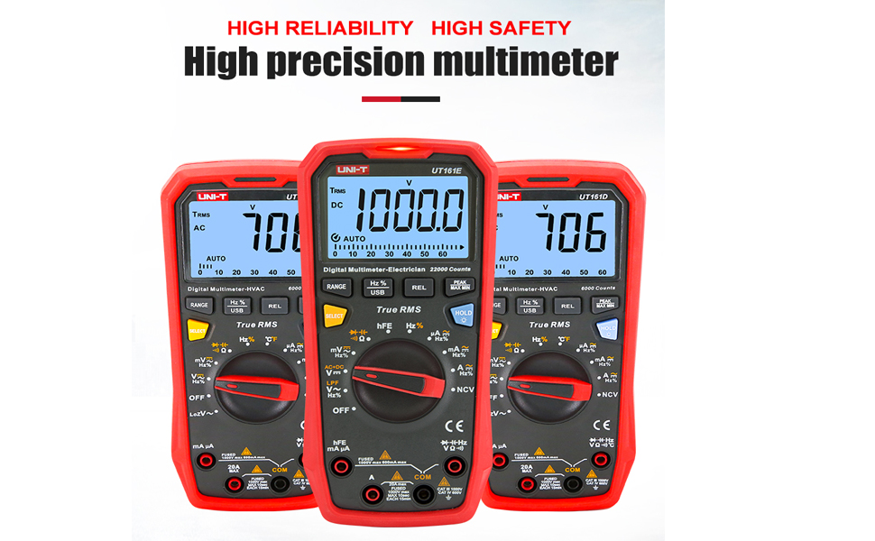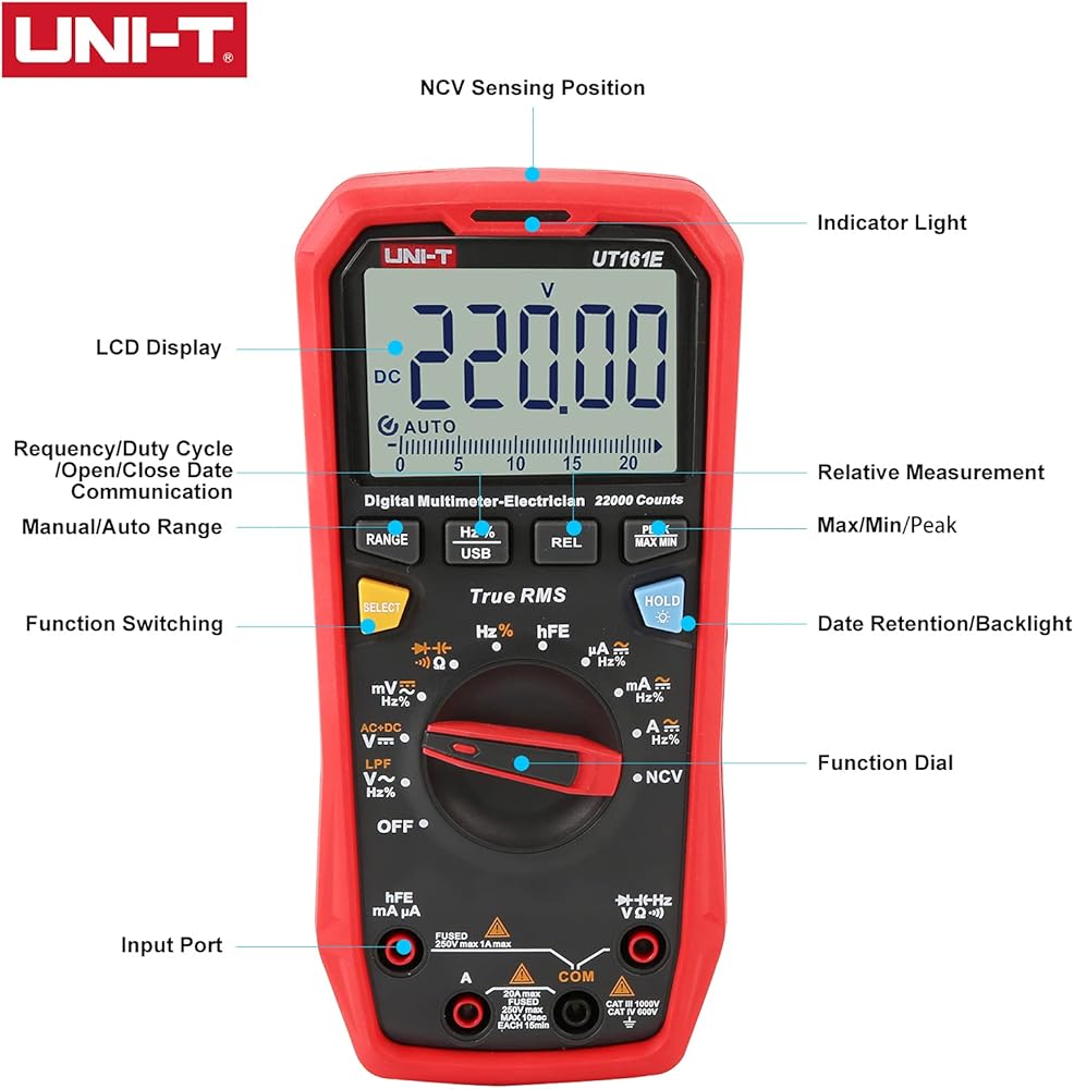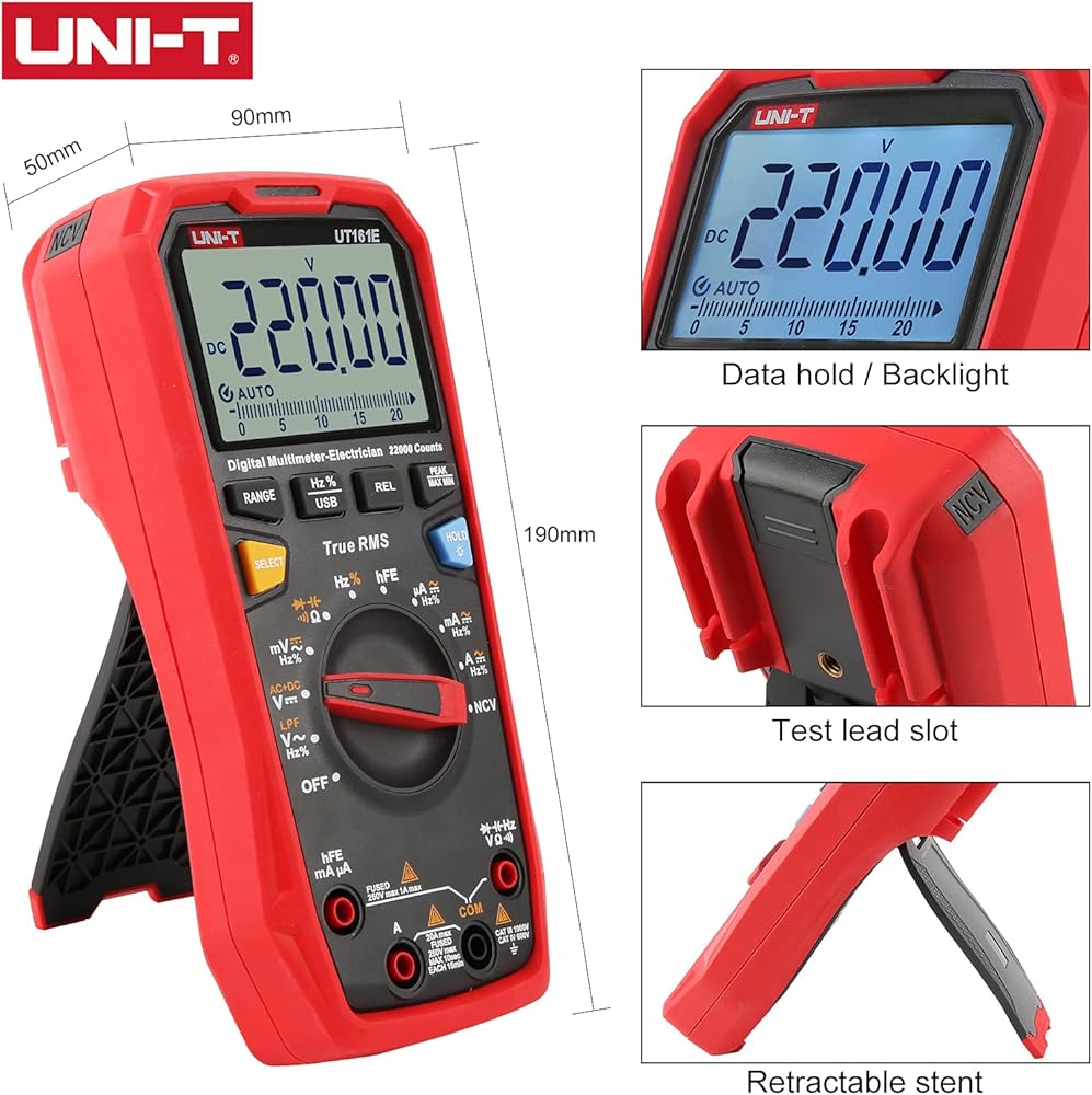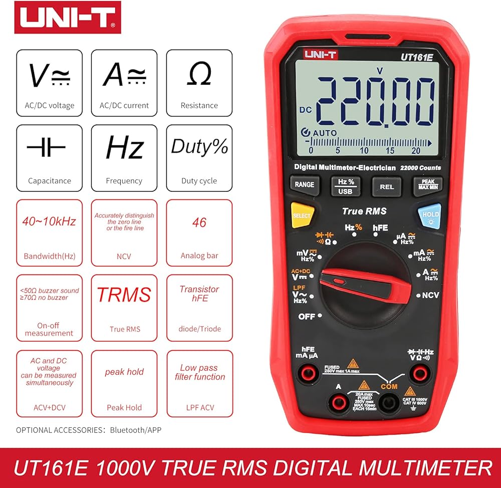 22000 Counts, AC/DC voltage up to 1000V, AC/DC current up to 20A, resistance, capacitance, frequency, duty-cycle, bandwidth, 46 analog bar, etc. Features with ACV+DCV, hFE, LPF ACV, USB data transmission