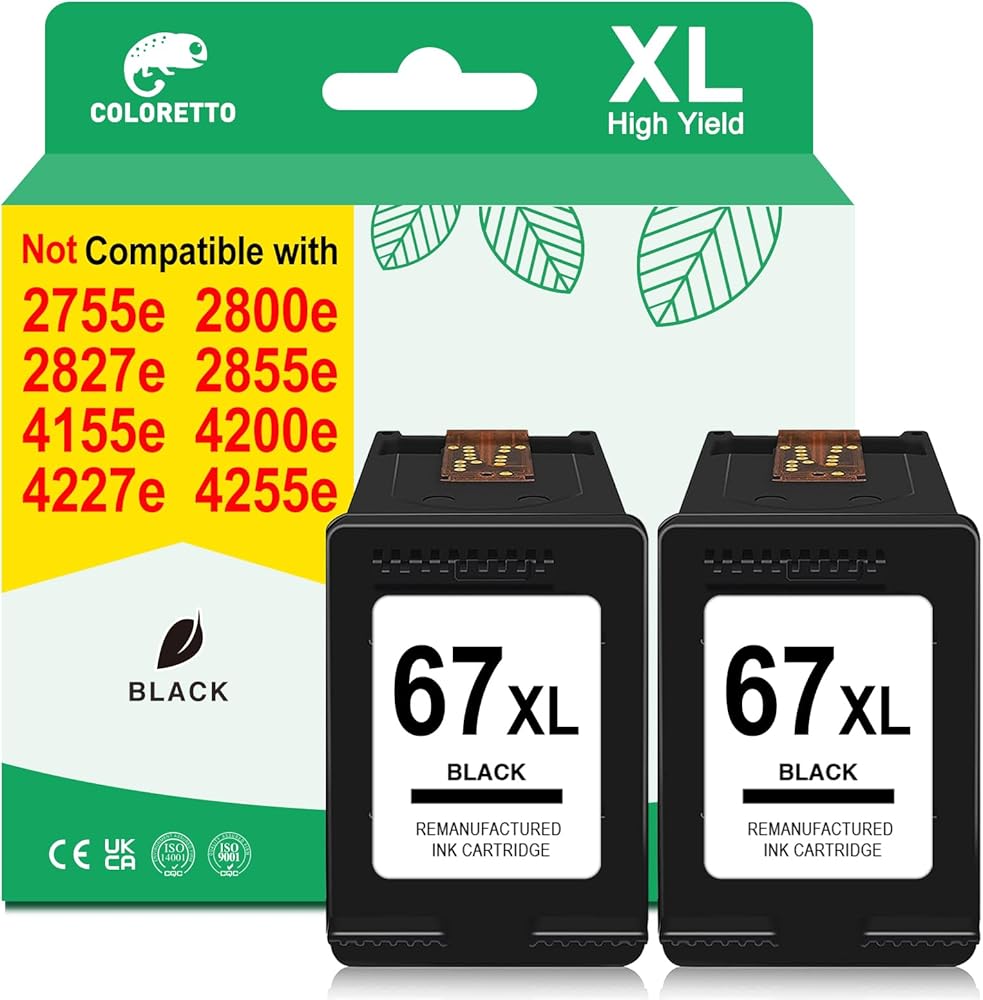 ◀ أحدث رقاقة وإنتاجية عالية للصفحات: خراطيش الحبر المعاد تصنيعها COLORETTO 67 XL، 67 XL (1 أسود، 1 لون، عبوتان، غير OEM) تستخدم تقنية الرقاقة المتقدمة لقراءة مستويات الحبر بدقة. تطبع خرطوشة الحبر الأسود 67XL (22 مل) ما لا يقل عن 650 صفحة، وتطبع خرطوشة الحبر الملون 67XL (20 مل) 450 صفحة على الأقل (استنادًا إلى تغطية 5% من ورق A4)، مما يوفر تكاليف الطباعة بشكل فعال.