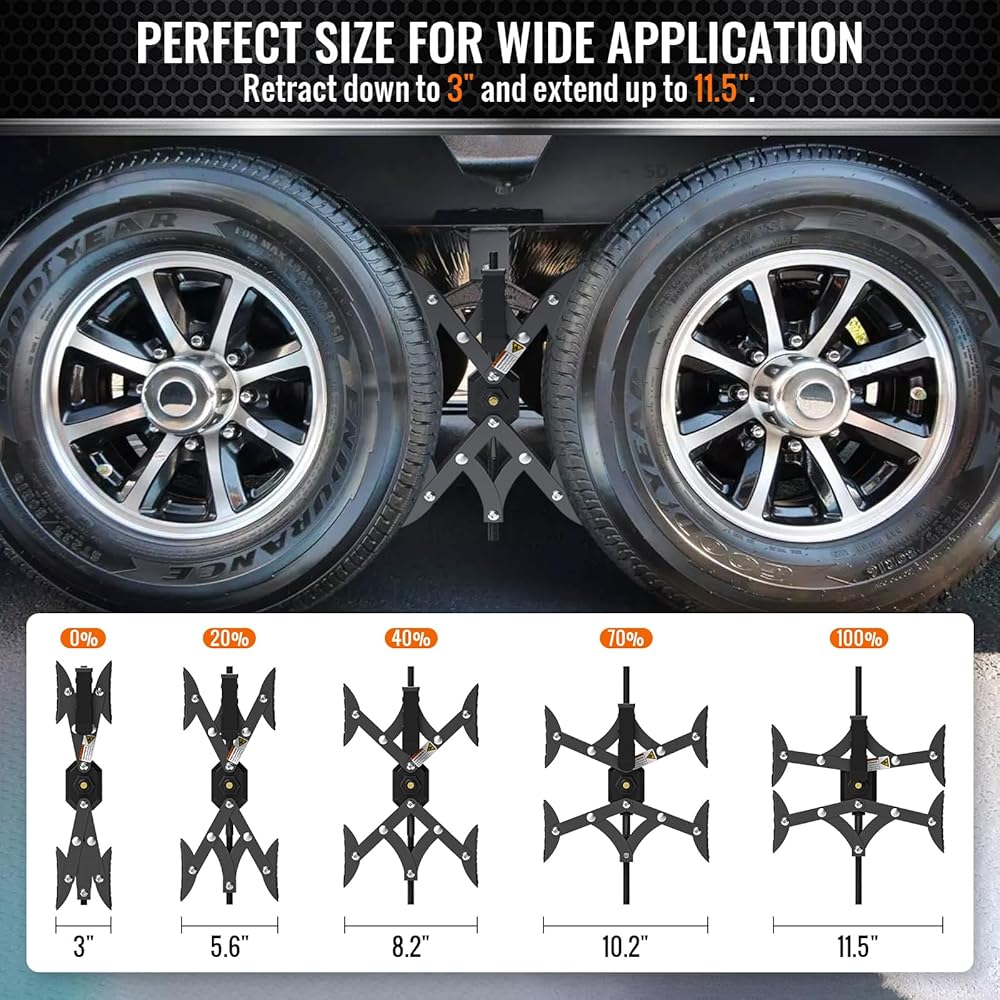 【حجم مثالي للاستخدام على نطاق واسع】يمكن أن تتراجع أحزمة عجلة التخييم إلى 3 بوصات وتمتد حتى 11.5 بوصة. تطبيقات لـ: مقطورة التخييم، عربة سكن متنقلة، شاحنات شديدة التحمل، مقطورة العجلة الخامسة، مقطورات العجلة الترادفية، حاملة الألعاب، منازل السيارات، إلخ. خذها معك واستمتع برحلة تخييم رائعة.