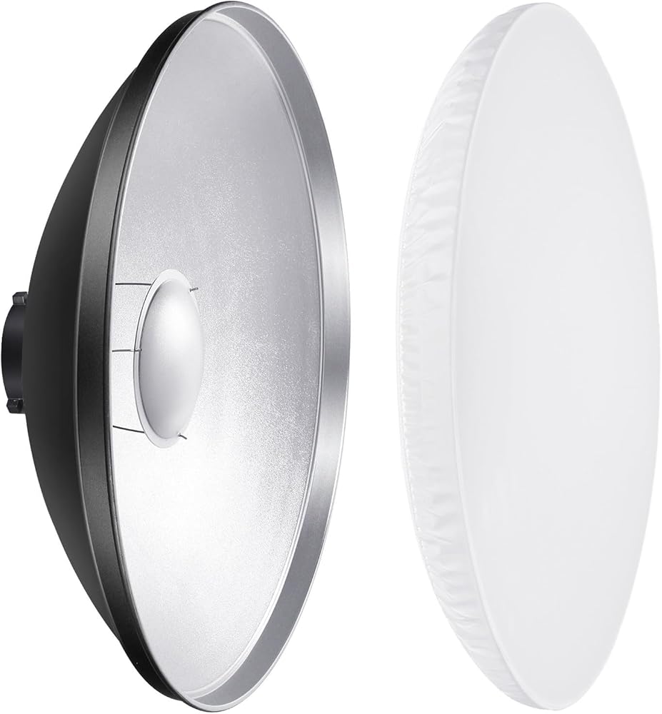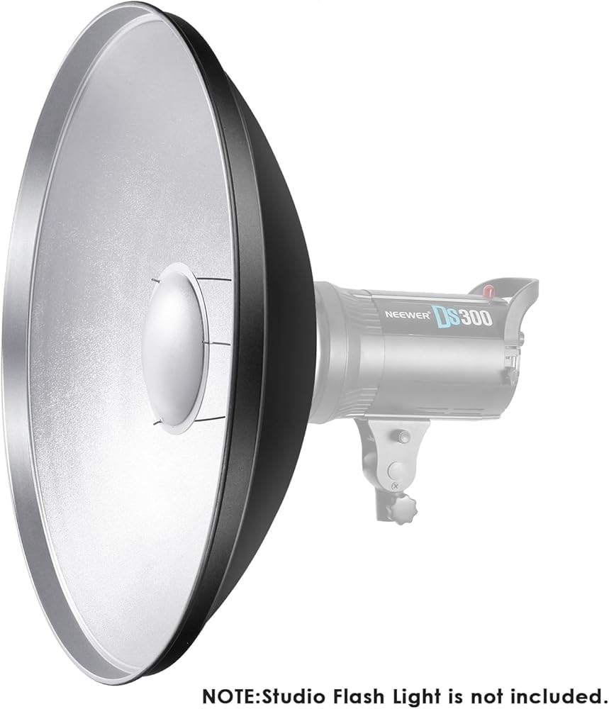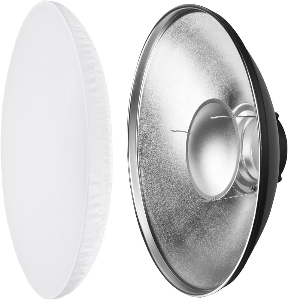 【انعكاس الضوء الممتاز】 يقوم عاكس طبق التجميل أولاً بإرجاع الإضاءة إلى الخلف باستخدام لوحة العاكس، ثم يملأها داخل الطبق، وأخيرًا يلقي شعاعًا واسعًا ومتساويًا. فهو يخلق ضوءًا مركزًا وناعمًا ومتساويًا يسلط الضوء على ملامح وجه الهدف مع تقليل الظلال القاسية. تعمل التصميمات الداخلية الفضية على تعزيز شدة الإضاءة وتحتفظ بنسخة الألوان المحايدة.