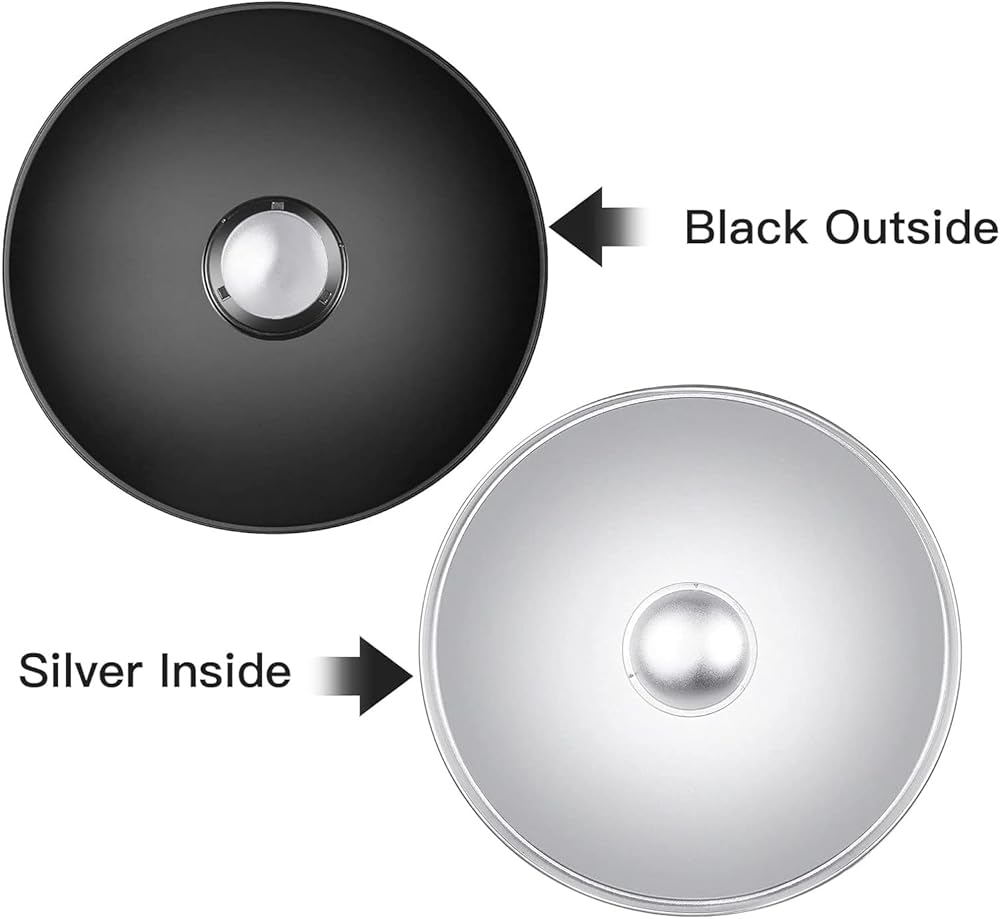 【تركيب بوينز القياسي】 يمكن للعاكس القياسي لطبق التجميل YUOCU أن يعلق على أي ضوء باستخدام حامل بوينز القياسي. أسود من الخارج وفضي من الداخل: يغير شكل وشدة الضوء الناتج من رؤوس الفلاش، ويوفر انتشارًا متساويًا للضوء حول الموضوع ويخلق تأثير إضاءة ناعم الحواف. وينتج عن الجزء الداخلي الفضي درجة وضوح أعلى.