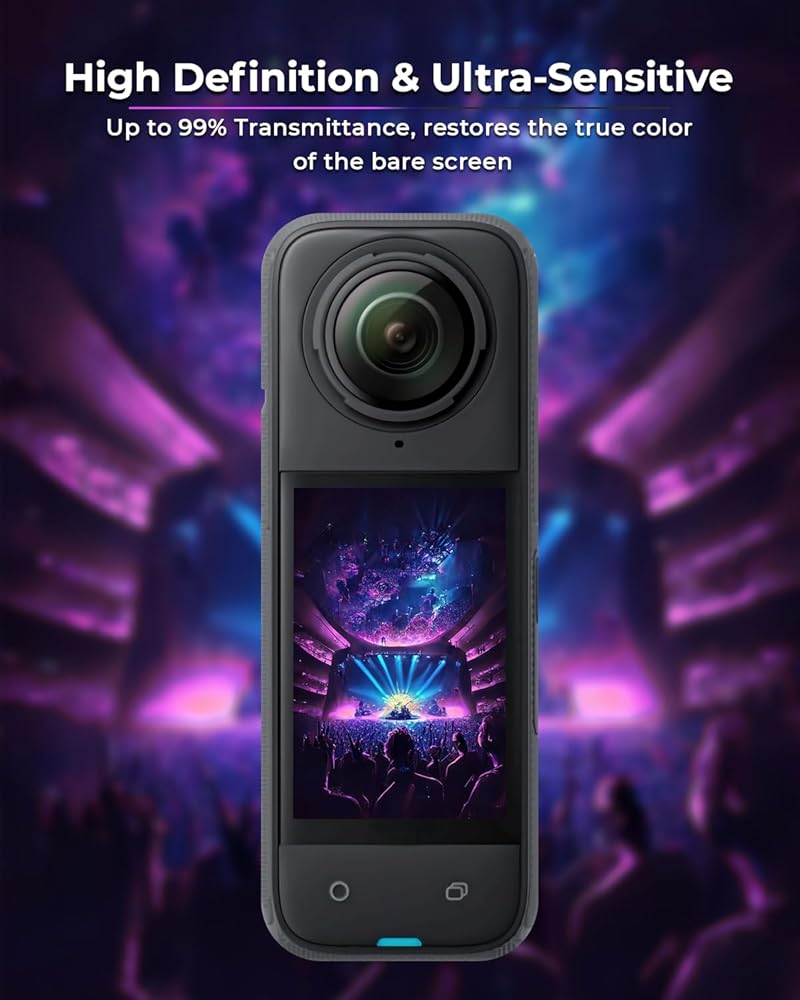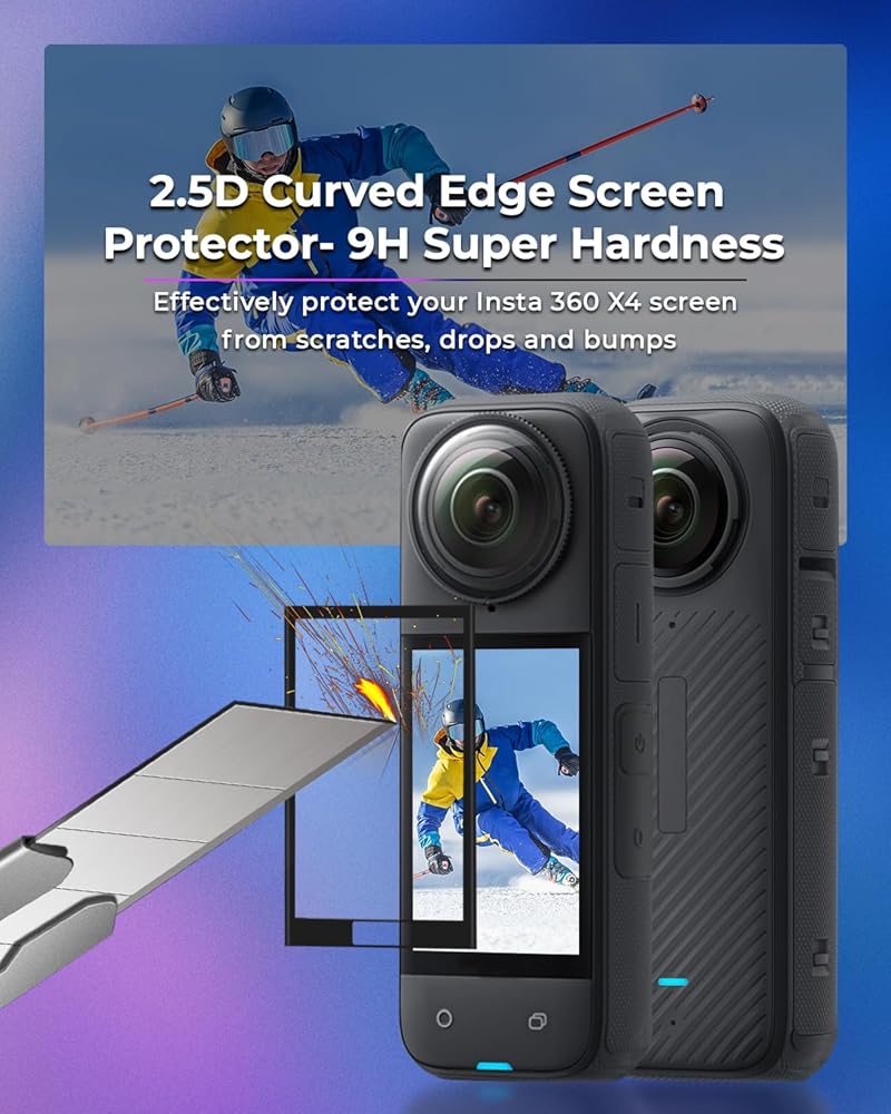 【9H Hardness & Scratch Resistant】9H hardness Insta 360 X4 screen protector effectively protects your X4 screen from scratching, scrapes, dust, fingerprints and impact. Provides 99% ultra-clear high-definition viewing. The super thin screen protector allows sensitive touch feeling, fast responsiveness, and ultimate playing experience.