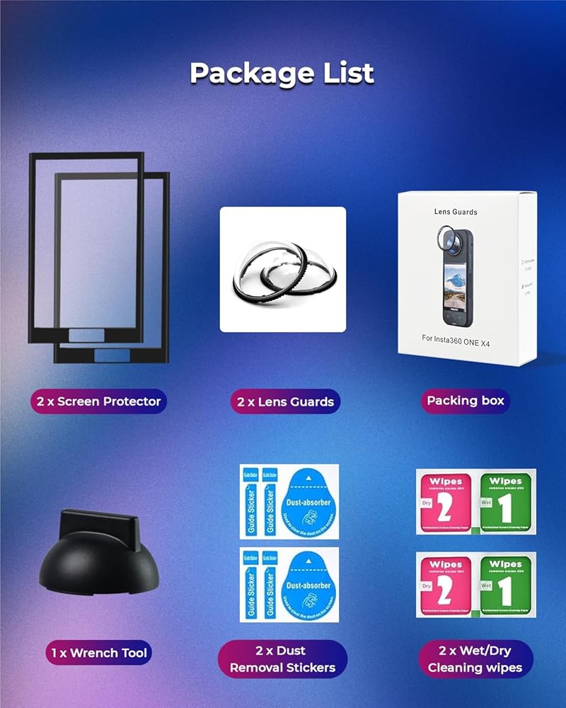 【Bubble-Free Installation】Cleaning your Insta 360 X4 screen and aligning it properly. It's easy to install with no bubbles and fingerprints. Package Included: 2x Insta 360 X4 Lens Guards, 2x Insta 360 X4 Screen Protector, 1x Wrench Tool, 2x Wet/Dry Cleaning wipes and 2x Dust Removal Sticker