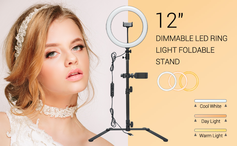 [12" Adjustable Ring Light] - 12 inch ring light, inside diameter 9.4 inch(23.9cm), which can hold up to 1 cell phones at once easy for TikTok, Youtube or videoconferencing. 180° adjustable lighting angle, 550Lux @0.5M, CRI 90+, TLCI 90+, 222 Pcs high quality Godox LED beads bulbs with a wide dimming range from 10%-100%.