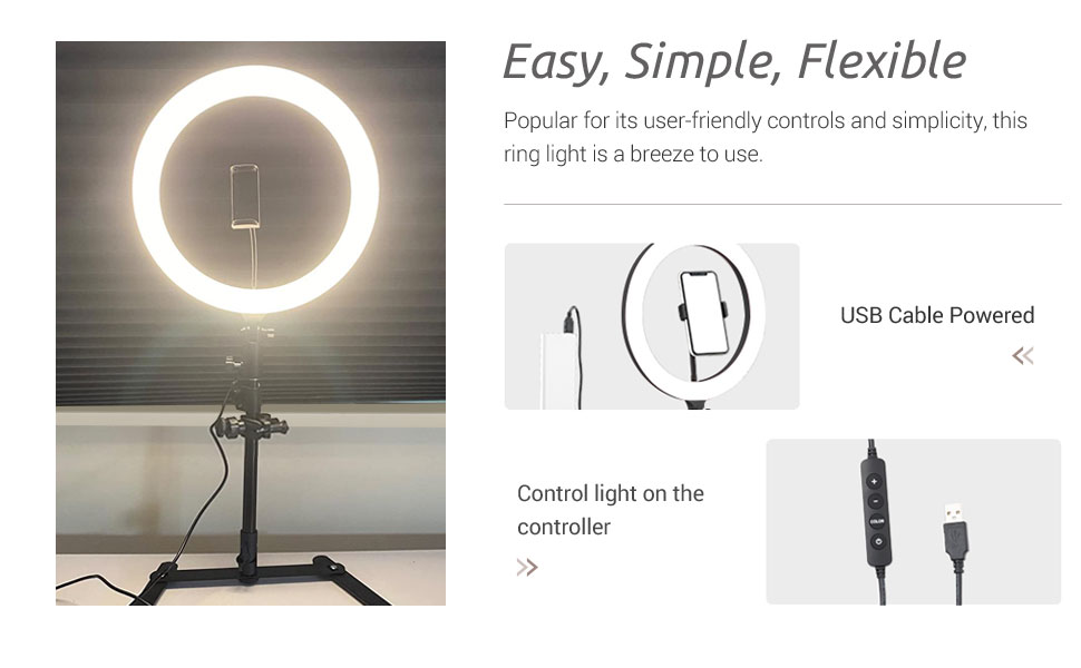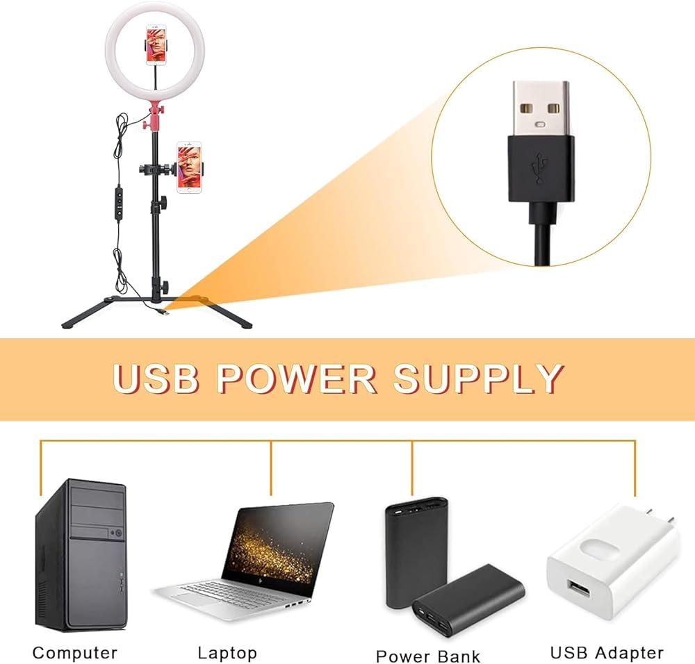 [USB Power Supply] - LR120 12 inch ring light with 10W power and 5V/2A USB power supply, It can be connected to a variety of things to use, such as Computer, Laptop, Power Bank,USB Adapter. You can control light settings with lamp cable, very practical and easy to use.