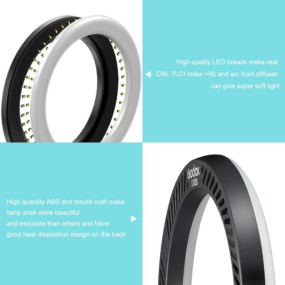 [Bi-Color LED Ring Light] - Godox LR120 ring light renders even, soft illumination, it with 3 daily light (white, warm white, warm yellow). Cold and warm with color temperature 3000K-6000K, choose the lighting color that best suits your skin tone, which makes the portrait more attractive and realistic.