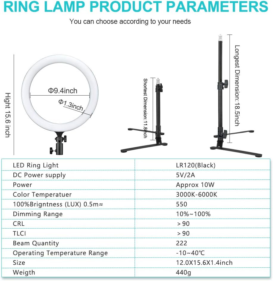 [360° Adjustable Phone Holder] - The 12'' ring light LR120 with adjustable light stand(11.8-18.5 inches) for change angle of use and stabilization. Phone holder that install on the lamp, it is compatible with most smartphones, and also has a 360° cell phone clip for your second phone.