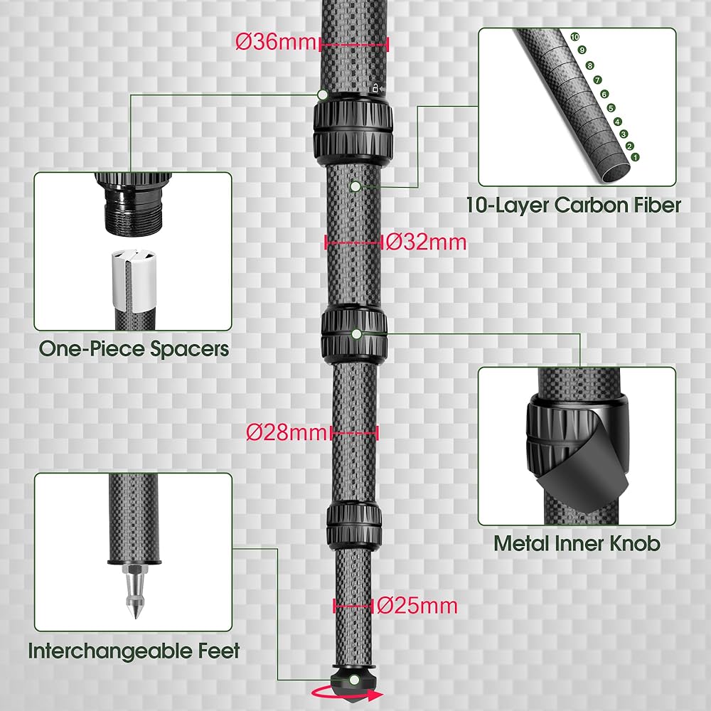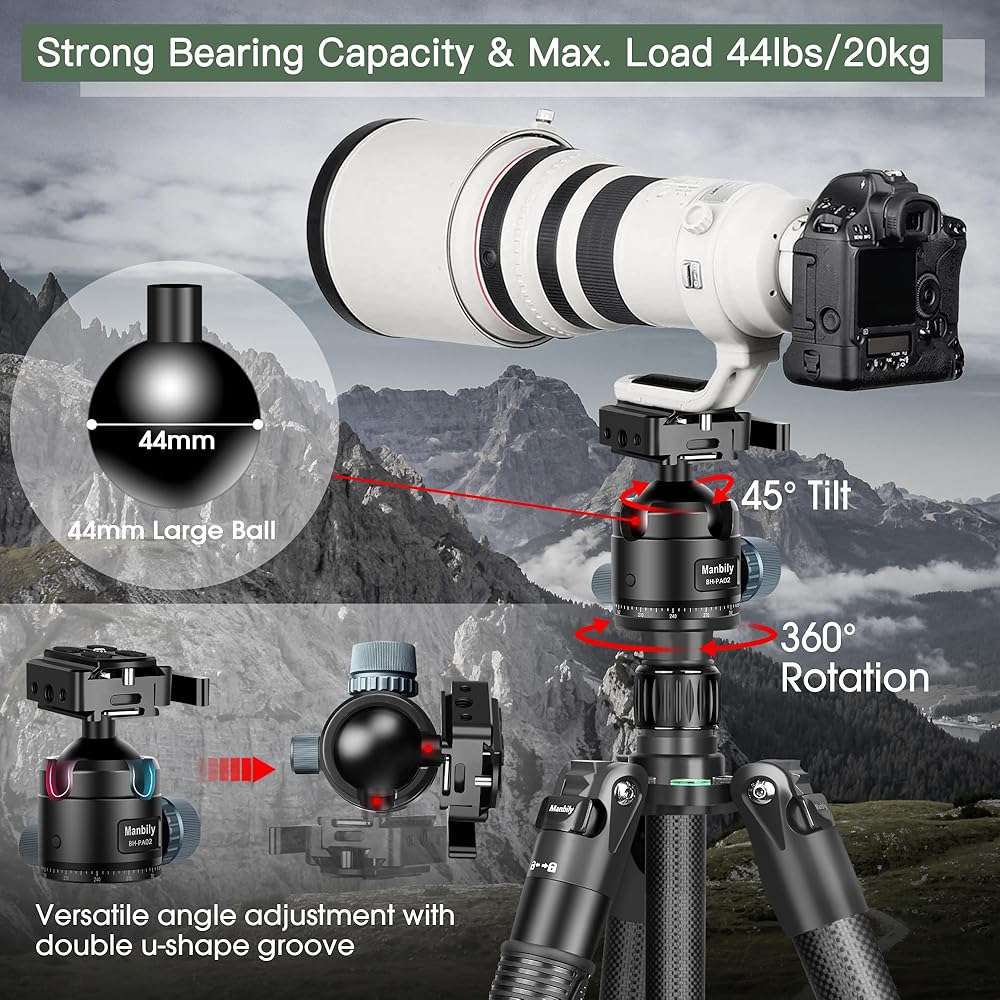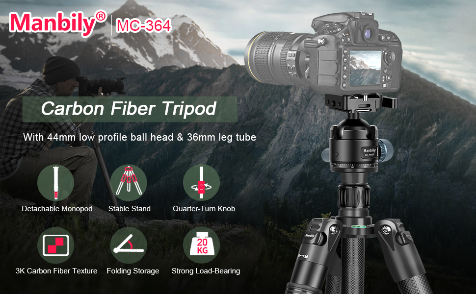 Manbily Hunting Tripod, Carbon Fiber Tripod with 44mm Low Profile Ball Head, Heavy Duty Stable Camera Stand Detachable Monopod, 36mm Max Leg Tube, Max Load 44lbs/20kg (MC-364)